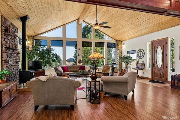 The finished basement includes a fully functional apartment with private entrance, full kitchen, bedroom, and bath—ideal for guests or rental income—plus a fifth bedroom, ¾ bath, and expansive living area perfect for entertaining. An oversized three-door garage accommodates up to six vehicles, with additional space for RV storage. Active solar, well-maintained systems, and negotiable extras (hot tub, tractor, riding mower) add even more value. Horses are welcome. All just 10 minutes from downtown Parker—offering the perfect balance of convenience and peaceful country living.