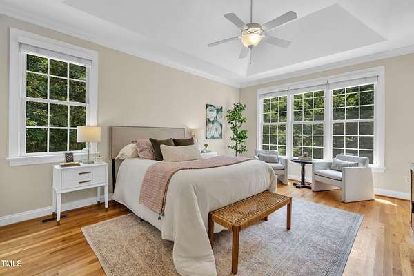 Tucked away on over 3 wooded acres in the sought-after Cedar Grove neighborhood, this spacious 4,113 SF home blends privacy, natural beauty, and versatile living space just minutes from Chapel Hill and Carrboro. Built in 2006 and freshly updated with interior and exterior paint plus new carpet upstairs and on the lower level, the home lives large with an open floor plan, vaulted ceilings, and abundant natural light. The chef's kitchen is the heart of the home, featuring a wall oven and microwave, stainless steel appliances, a tile backsplash, undercabinet lighting, and a peninsula with bar seating. Enjoy meals in the breakfast nook or host gatherings in the formal dining room. The family room centers around a cozy gas fireplace and dry bar, with seamless flow to the elevated deck and screened porch overlooking the treetops and backyard. While the septic permit allows for three bedrooms, the home easily lives like six with four full bathrooms, a half bath, and multiple flexible rooms for bedrooms, an office, or play spaces. The private owner's suite is a retreat, complete with access to the deck, a walk-in closet with windows, and a spa-like bath featuring a soaking tub, separate shower, dual vanities, and water closet. The finished lower level expands the living space with an oversized media room, playroom, office, and a workshop with its own entry. Outdoors, enjoy raised garden beds, a long concrete driveway with a parking pad, and a two-car garage. With no HOA dues, friendly neighbors, and plenty of space to walk, bike, and run, this property balances community and privacy. Practical features include three HVAC units, radon remediation with long-term levels below 1 ppm, and generous parking both on- and off-street. With its wooded setting, thoughtful updates, and versatile layout, this home is ideal for those seeking both comfort and flexibility. Highlights - 4,113 SF, built 2006 - Septic permit for 3 BR, lives like 6 - 4 full baths + 1 half bath - Chef's kitchen with stainless appliances & bar seating - Vaulted ceilings & open floor plan - Large screened porch & deck with forest views - Private owner's suite with spa bath & deck access - Finished basement with media room, playroom, office & workshop - Fresh paint inside & out; new carpet upstairs & downstairs - 2-car garage + parking pad; long driveway - Over 3 wooded acres in Cedar Grove neighborhood - No HOA dues; peaceful, walkable setting