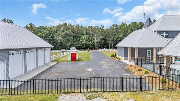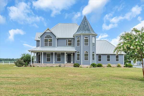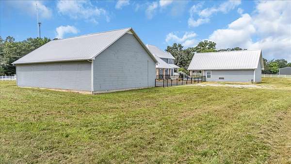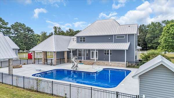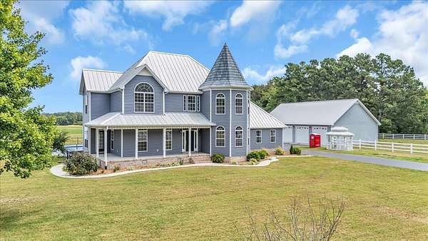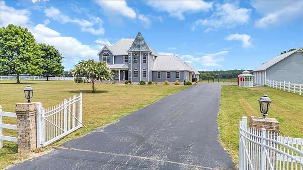 Additional features include a Standing Seam Metal Roof, 4 Car Detached Garage measuring 40'x60' with upstairs storage and 10'x10' Doors, Barn with 3 fenced areas for Animals.