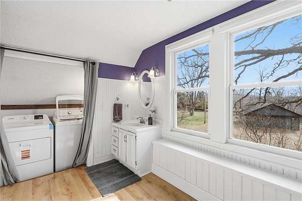 The home will find comfortable living spaces designed for everyday living and gathering. New appliances, 2024 new furnace and water heater. The interior offers a welcoming layout with natural light, functional rooms, and the opportunity to make the space your own while enjoying the incredible acreage setting. Large skylights and vaulted ceilings with a main floor bathroom, shower and bedroom. Upstairs has two bedrooms and a full bathroom with modern laundry with new dryer.