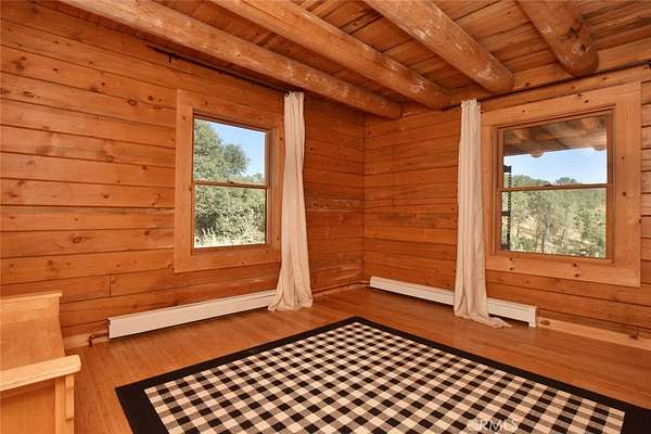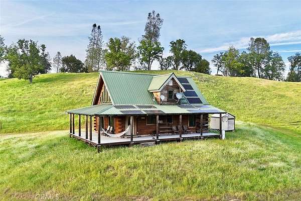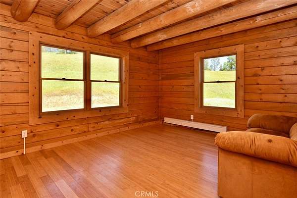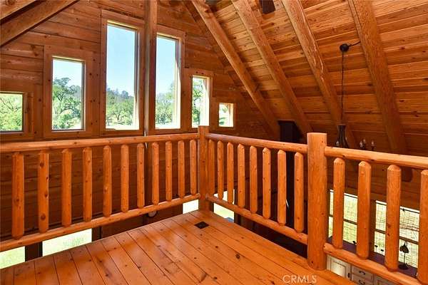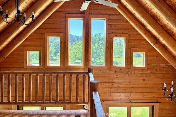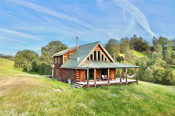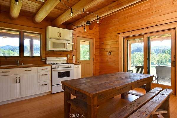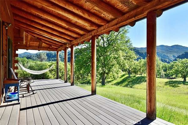 Built in 2010, the 1,626± square foot log home features 3 bedrooms, 2 bathrooms, and a spacious loft overlooking the main living area. Vaulted ceilings with exposed beams create an open, inviting atmosphere, while large wood-clad windows bring in natural light and frame the surrounding landscape. A covered porch spanning two sides of the home extends the living space outdoors and captures sweeping views of rolling hills, open meadows, and mature oak trees. Wood-clad sliding glass doors from both the living room and dining area open directly to the front porch, creating a seamless indoor-outdoor connection.