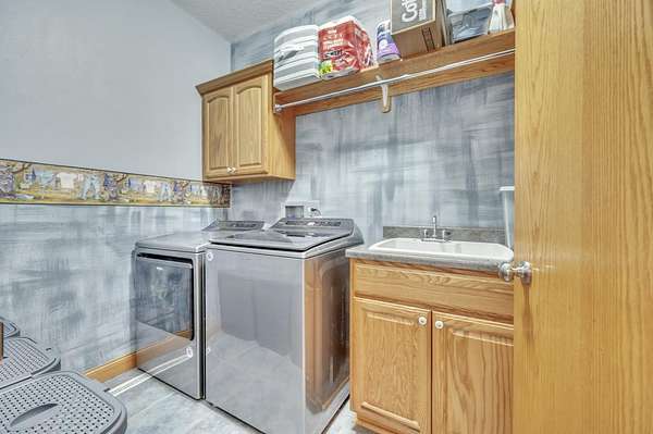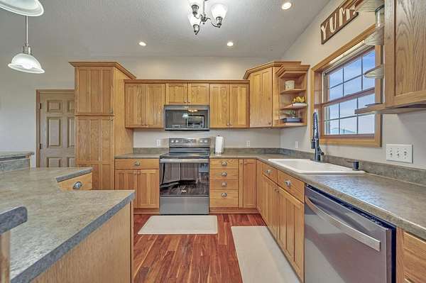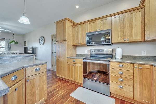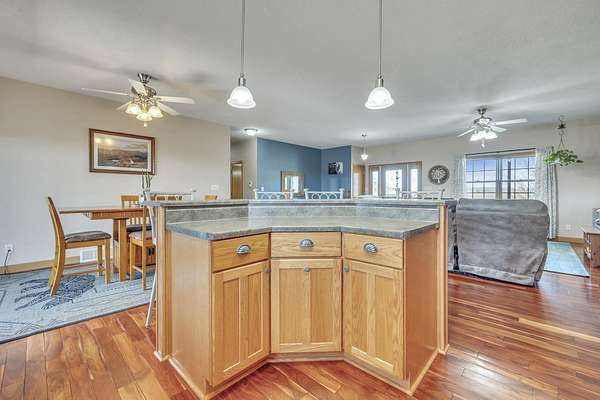 - Ceiling Fan(s), Eat-In Kitchen, Garage Door Opener, Kitchen Center Island, Main Floor Bedrooms, Main Floor Laundry, Washer/Dryer Hkups, Window Coverings