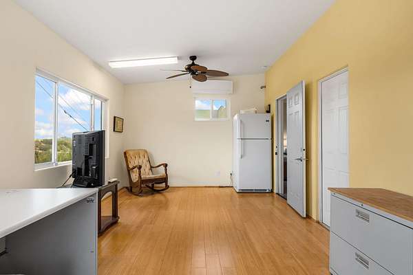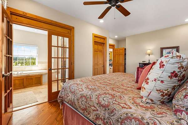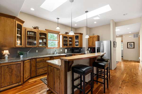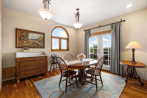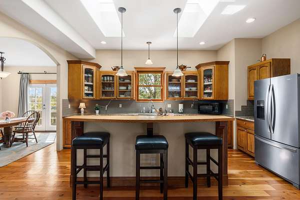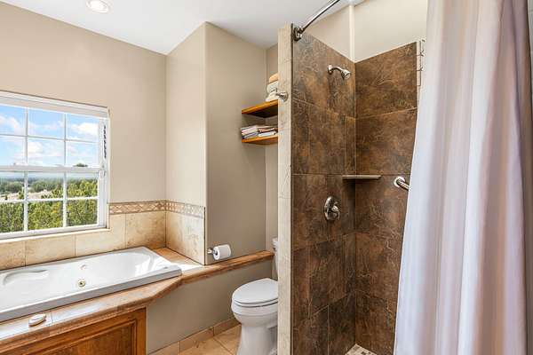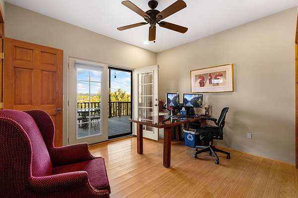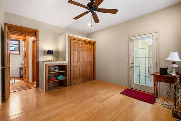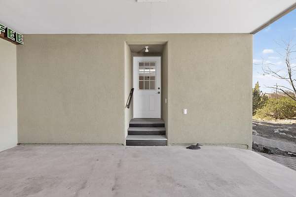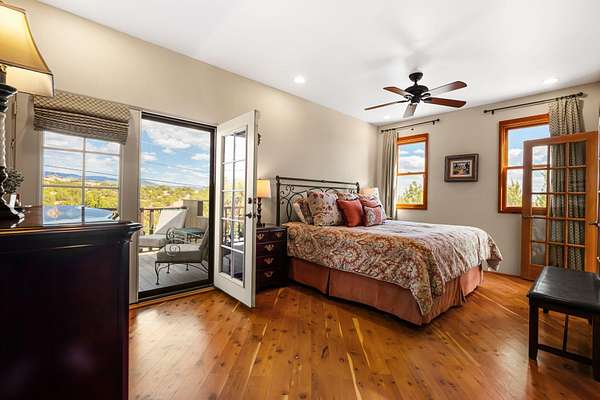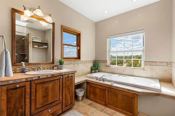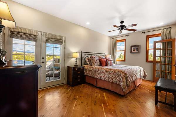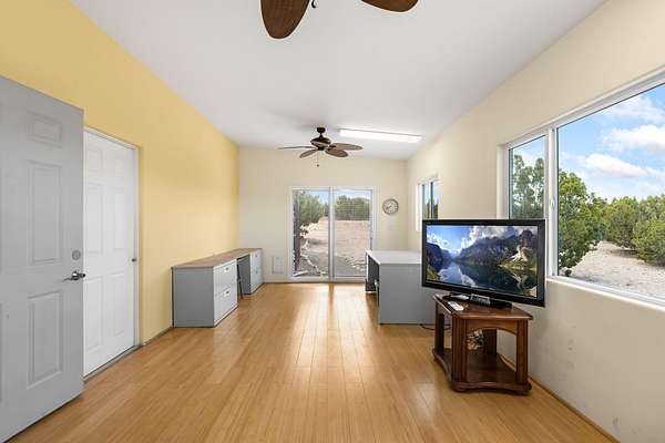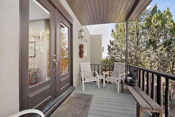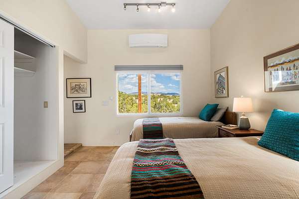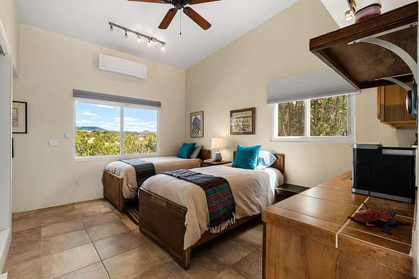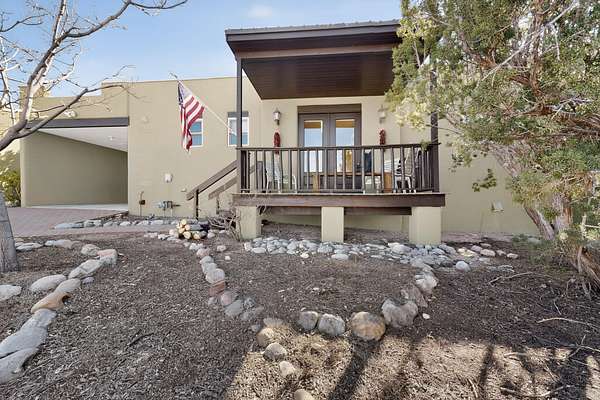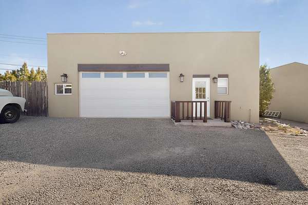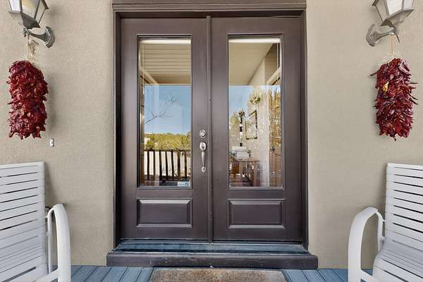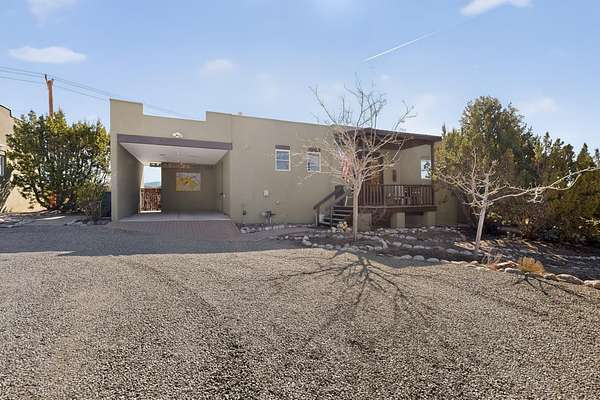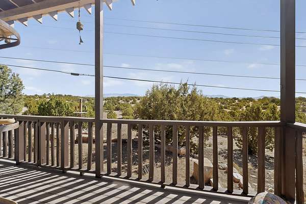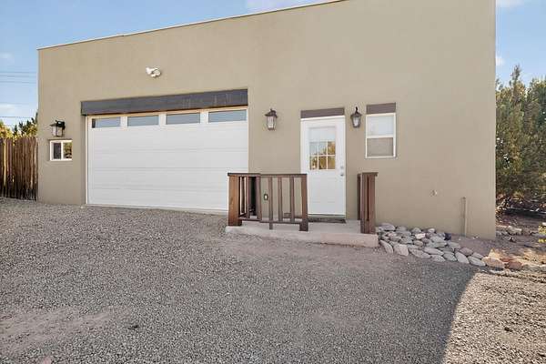 Tucked away on 2.5 tree-covered acres, this private country retreat offers stunning views of the Sangre de Cristo Mountains. The property blends tranquility with accessibility. A detached guest house features a 3/4 bath and a spacious living/sleeping area, and an enclosed courtyard, all with beautiful eastern views. The finished two-car garage includes abundant windows, a loft, and direct entry. The main home is primarily single-level, offering an open-concept great room and kitchen with high viga ceilings, fireplace, built-in media center, and French doors leading to the east deck. The private primary suite includes walk-in closet and a spa-like bath with jetted tub and separate shower. A flexible third bedroom with courtyard access is perfect for a home office.