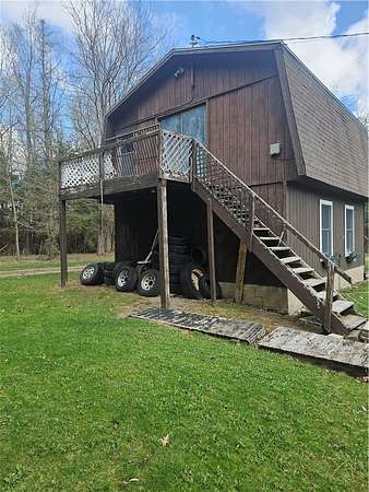 Rustic retreat set on nearly 30 acres, offering a unique blend of privacy, natural beauty, and opportunity. This 2-bedroom home with loft space is filled with natural light and features multiple flexible bonus areas suitable for a variety of uses. The primary bedroom includes a gas fireplace and double closets. The property includes a 3-stall barn and several outbuildings, including a detached garage with a studio apartment that has been gutted and is ready for renovation. The acreage may support agricultural or recreational uses such as keeping animals like horses or goats. A private pond and additional water features enhance the peaceful setting, while maintained trails wind throughout the property. The land may offer opportunities for outdoor recreation such as fishing or hunting. The home requires updates and is being offered as-is, presenting a great opportunity for buyers to bring their vision and improvements. With expansive land and diverse outdoor features, this property offers a wide range of potential uses.