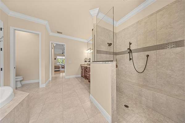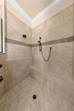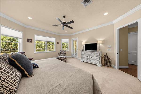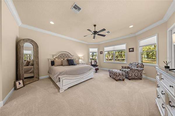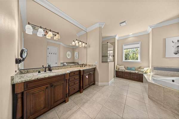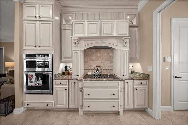 - Crown Molding, Eat-In Kitchen, High Ceilings, Kitchen/Family Room Combo, Living Room/Dining Room Combo, Primary Bedroom Main Floor, Solid Wood Cabinets, Split Bedroom, Stone Counters, Tray Ceiling(s), Walk-In Closet(s), Window Treatments