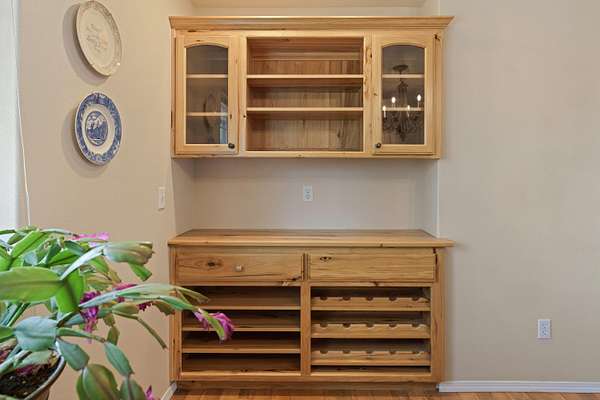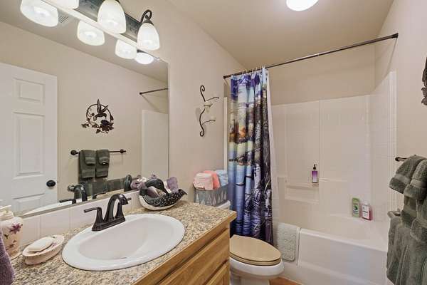 - Built-In Features, Central Vacuum, Double Vanity, Kitchen Island, Laminate Counters, Linen Closet, Open Floorplan, Pantry, Primary Downstairs, Shower/Tub Combo, Tile Shower, Walk-In Closet(s)