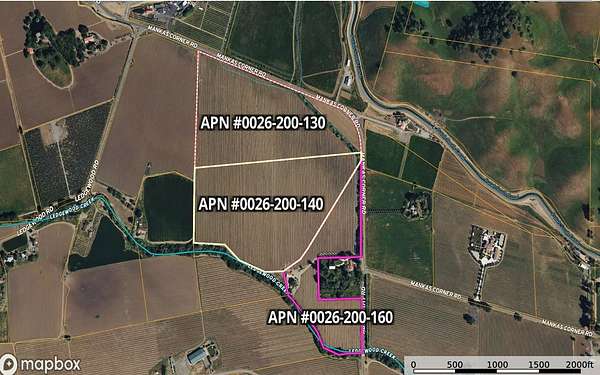 This one of kind Northern California/ Solano County vineyard property boasts unrestricted picturesque views of the nearby Gordon Valley Hills and is flanked by the seasonal Ledgewood Creek on its southern boundary and Abernathy/ Mankas Corner Roads on its eastern and northern boundaries. Its recently cleared, deep, Class I soil and abundant Solano Irriagtion District (SID)/ Lake Berryessa ag water are sure to enhance your premier vineyard and/ or winery development plans. The property includes two 3 bedroom/ 2 bath 940 +/- square foot manufactured homes permitted as farmworker housing and one 1950’s era 1,070 +/- square foot 3 bedroom/ 1 bath conventional home-- all situated on the smallest of the three parcels. A proven domestic well and two standard septic systems support the three homes. A generous size 1,575+/- square foot metal-sided ag barn provides for farming equipment storage.