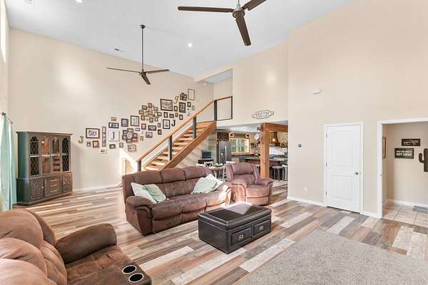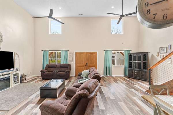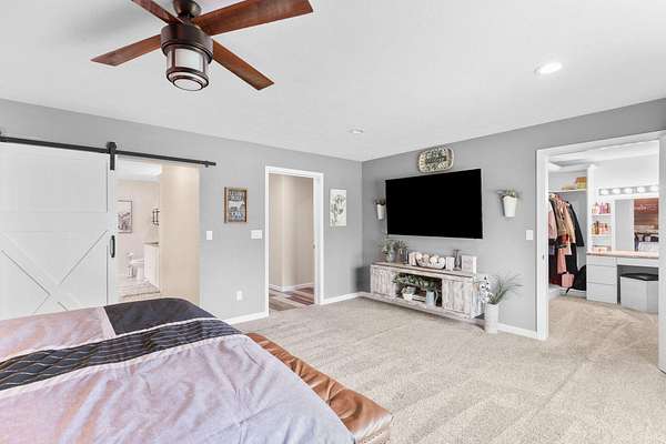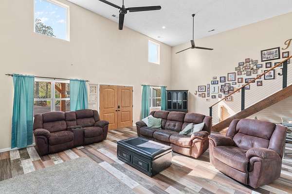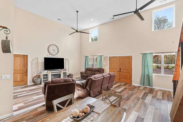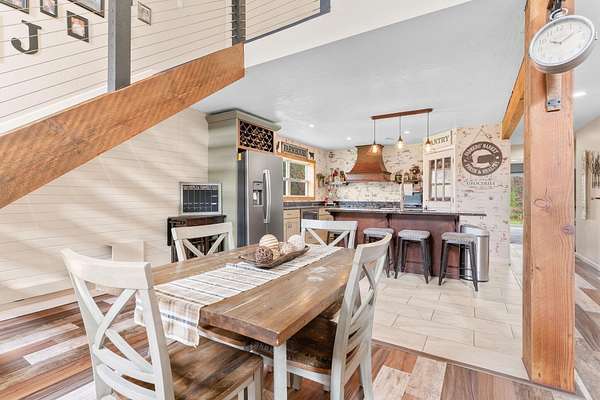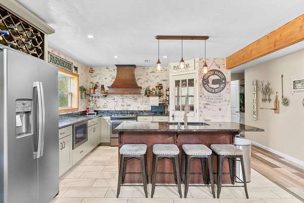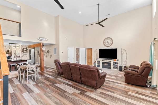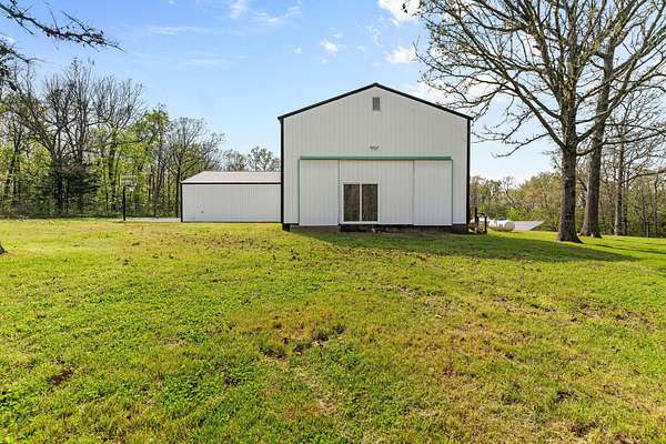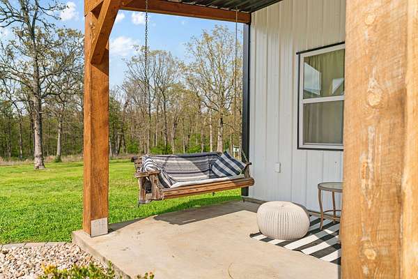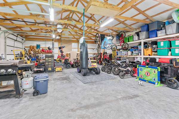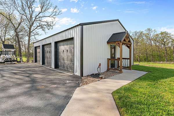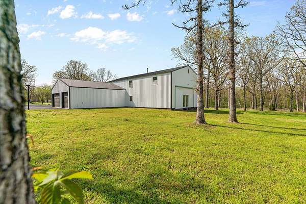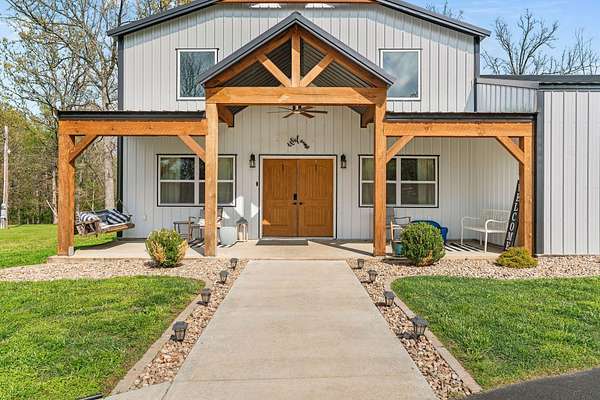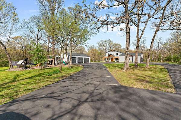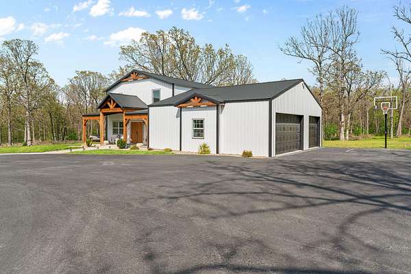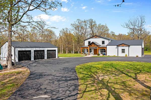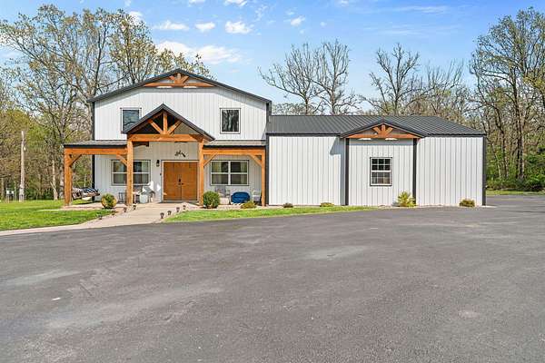 Welcome to modern country living at its finest! Nestled on approximately 2 secluded acres, this stunning barndominium-style home is tucked away down a paved circular drive, offering both privacy and curb appeal. The striking white metal exterior is beautifully contrasted by black rooflines and trim, while warm wood beams accent the inviting covered front porch. This property is as functional as it is impressive, featuring both an attached 3-car garage and a matching detached 3-car shop--complete with concrete floors, electric, and ample storage space. Inside, you'll immediately be drawn to the soaring ceilings and bright, open layout. The spacious living room flows seamlessly into the dining area and into a beautifully designed kitchen full of rustic charm. Enjoy custom cabinetry, granite countertops, a center island with bar seating, stainless steel appliances, and a convenient corner pantry--perfect for both everyday living and entertaining. The main-level primary suite is a true retreat, offering private access to the backyard through sliding doors. The luxurious ensuite bath features a dual vanity, a soaking tub perfectly positioned beneath a window and chandelier, and a tiled walk-in shower with dual jets and a waterfall feature. The oversized custom walk-in closet includes a built-in vanity space for added convenience. On the main level you'll also find a half bath for guests and a spacious laundry room with abundant storage. A custom staircase leads upstairs to four additional bedrooms and a full bathroom, offering plenty of space for family, guests, or a home office setup. Step outside to enjoy the expansive yard with mature trees and a designated play area--ideal for relaxing or entertaining. Additional highlights include solar panels for energy efficiency and a newer roof, approximately 3 years old. This one-of-a-kind property perfectly blends modern style, thoughtful design, and peaceful country living--don't miss your opportunity to call it home!