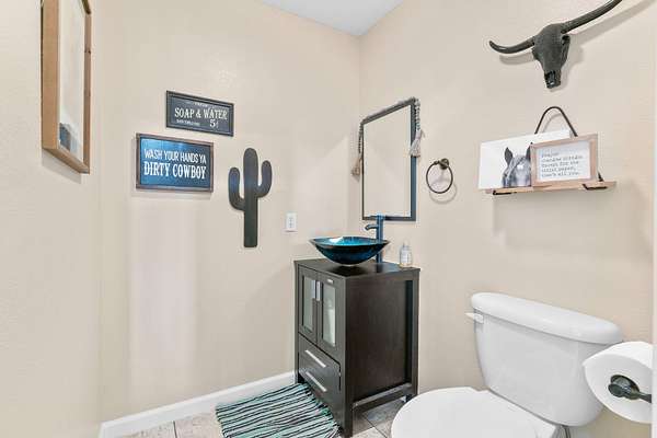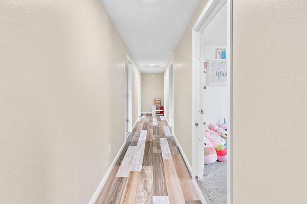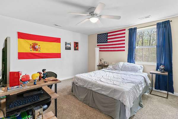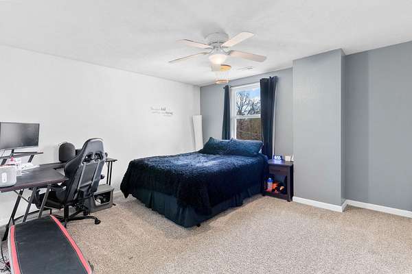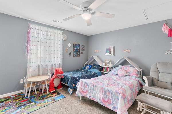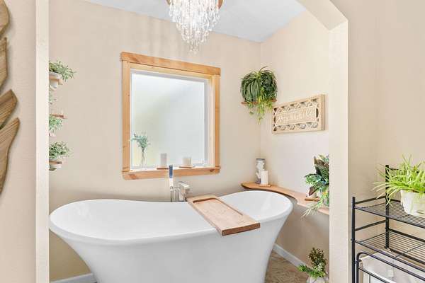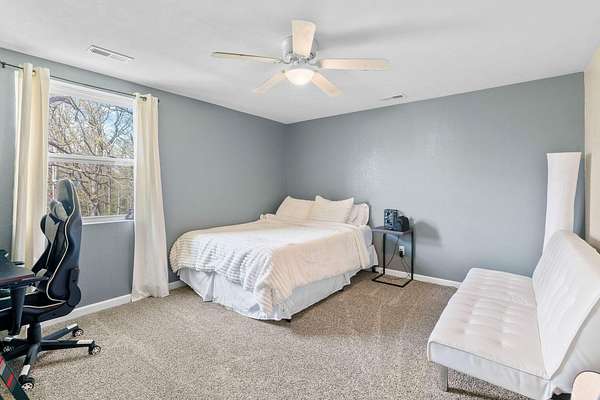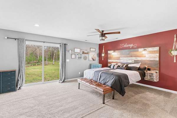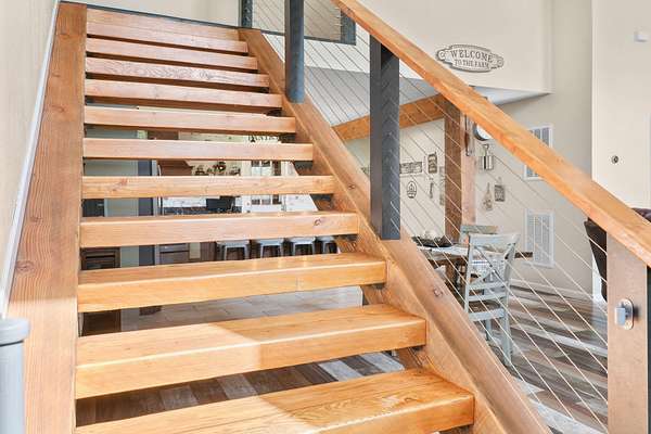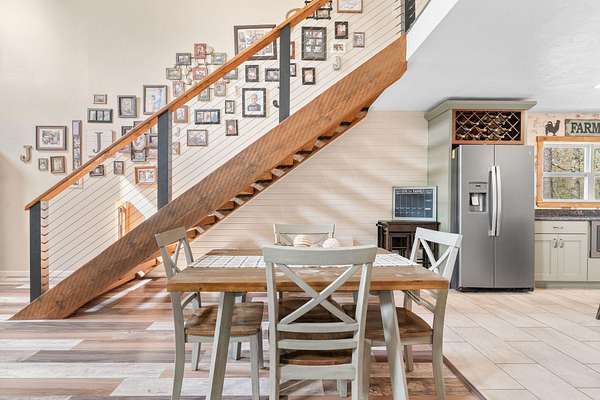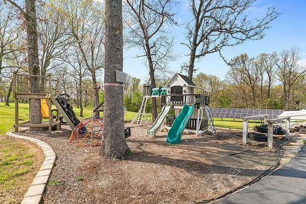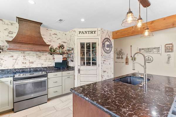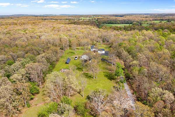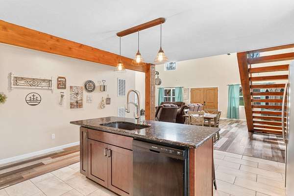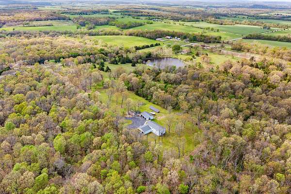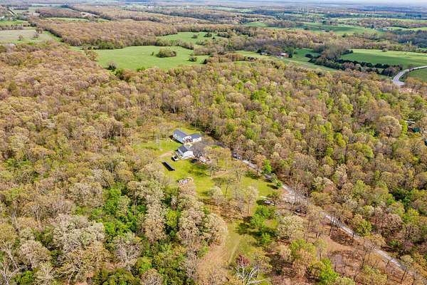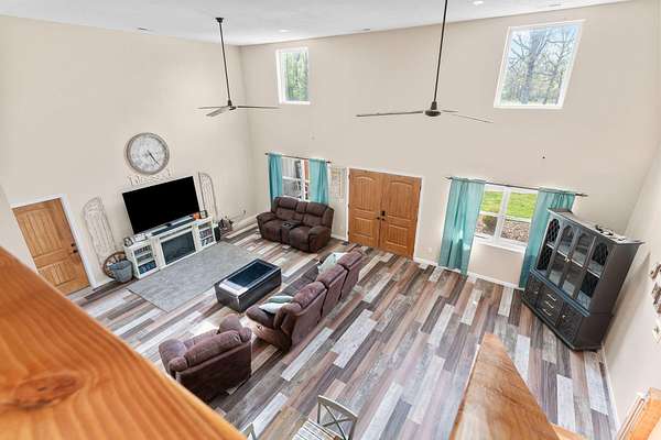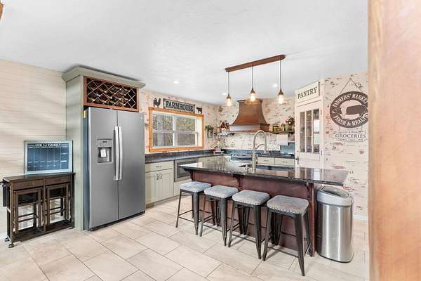 Welcome to modern country living at its finest! Nestled on approximately 2 secluded acres, this stunning barndominium-style home is tucked away down a paved circular drive, offering both privacy and curb appeal. The striking white metal exterior is beautifully contrasted by black rooflines and trim, while warm wood beams accent the inviting covered front porch. This property is as functional as it is impressive, featuring both an attached 3-car garage and a matching detached 3-car shop--complete with concrete floors, electric, and ample storage space. Inside, you'll immediately be drawn to the soaring ceilings and bright, open layout. The spacious living room flows seamlessly into the dining area and into a beautifully designed kitchen full of rustic charm. Enjoy custom cabinetry, granite countertops, a center island with bar seating, stainless steel appliances, and a convenient corner pantry--perfect for both everyday living and entertaining. The main-level primary suite is a true retreat, offering private access to the backyard through sliding doors. The luxurious ensuite bath features a dual vanity, a soaking tub perfectly positioned beneath a window and chandelier, and a tiled walk-in shower with dual jets and a waterfall feature. The oversized custom walk-in closet includes a built-in vanity space for added convenience. On the main level you'll also find a half bath for guests and a spacious laundry room with abundant storage. A custom staircase leads upstairs to four additional bedrooms and a full bathroom, offering plenty of space for family, guests, or a home office setup. Step outside to enjoy the expansive yard with mature trees and a designated play area--ideal for relaxing or entertaining. Additional highlights include solar panels for energy efficiency and a newer roof, approximately 3 years old. This one-of-a-kind property perfectly blends modern style, thoughtful design, and peaceful country living--don't miss your opportunity to call it home!