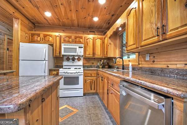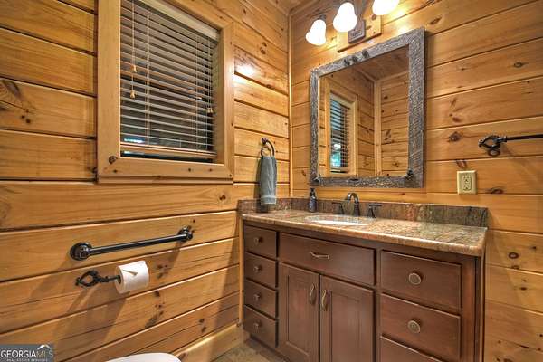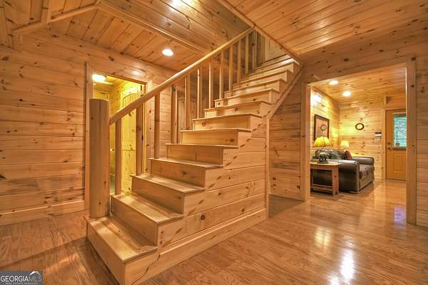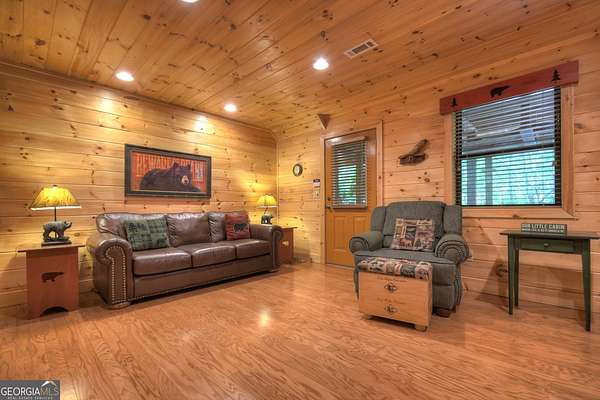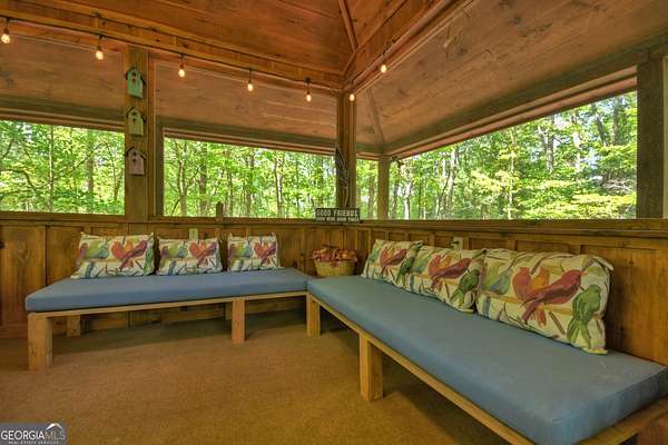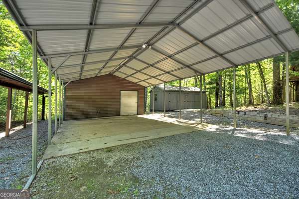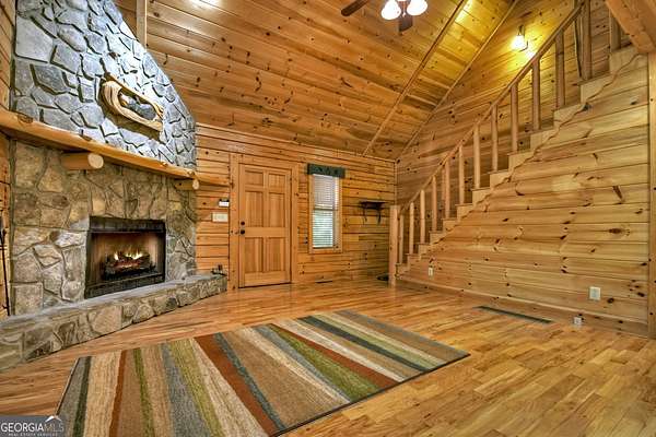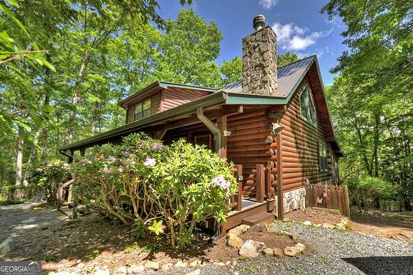 Discover your dream retreat at this enchanting 3-bedroom, 3-bathroom authentic log cabin nestled within the serene landscapes of Blue Ridge...This meticulously maintained home offers an ideal blend of rustic charm and modern updates, ensuring a cozy yet sophisticated living environment. The heart of the home features a majestic stone fireplace flanked by soaring ceilings and rich wood interiors, creating an inviting atmosphere that extends throughout the property. Large windows bathe the space in natural light, enhancing the warm, woodsy aesthetics. Each bedroom, including the primary bedroom & loft area, promises spacious comfort, while updated tile showers add a touch of elegance. Outdoor living is elevated with wrap-around porches and decks, perfect for relaxation or hosting gatherings. The property includes a robust fire pit area for cool evenings under the stars, and a whimsical, large treehouse-complete with a screened-in bunk area, fire pole, and zip-line-offers adventurous fun for all ages.The full finished terrace level features guest quarters and additional storage, complemented by a practical carport, a workshop area, additional covered parking with outdoor storage, plus a garage for motorcycles or outdoor gear. The property's delightfully landscaped yard blends seamlessly with its natural surroundings, increasing its curb appeal. Just a stone's throw from the Toccoa River and surrounded by numerous hiking and biking trails, the cabin is also a short drive from the historic downtown area, offering both privacy and accessibility to local attractions. Whether you're seeking a profitable vacation rental or a family home or retreat, this property is a true gem that encapsulates the best of mountain living.