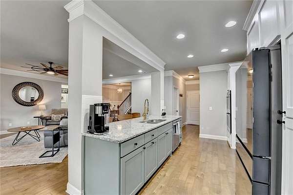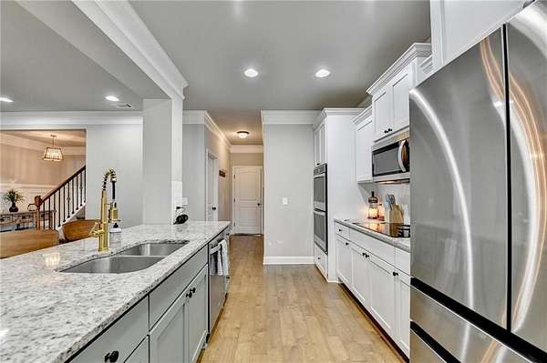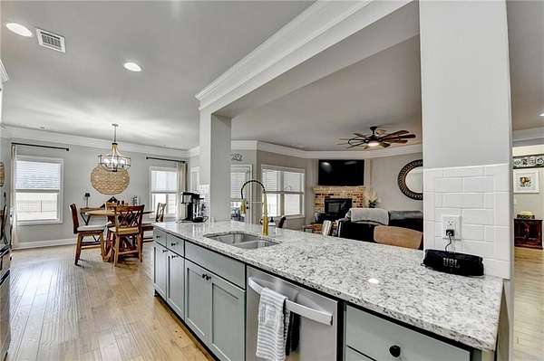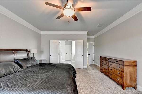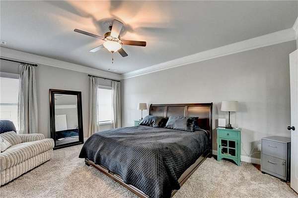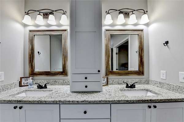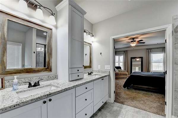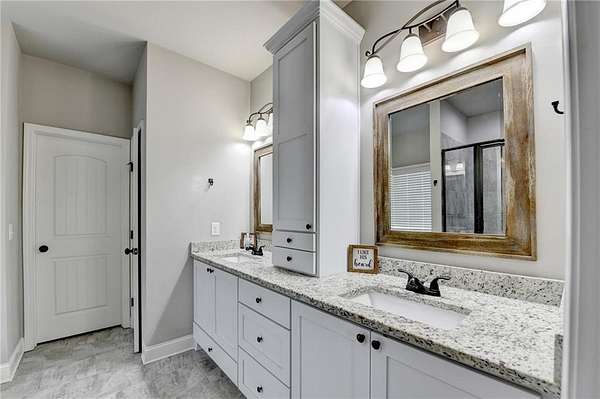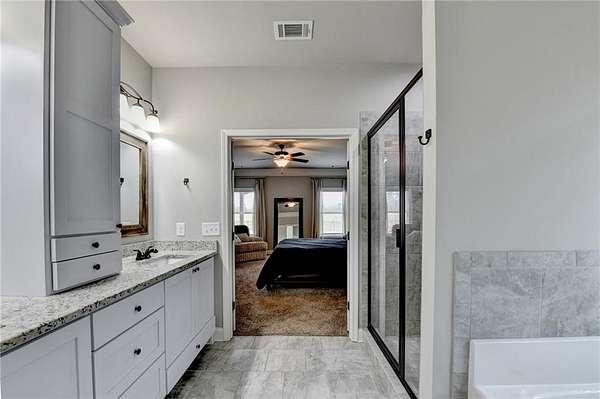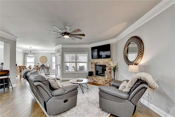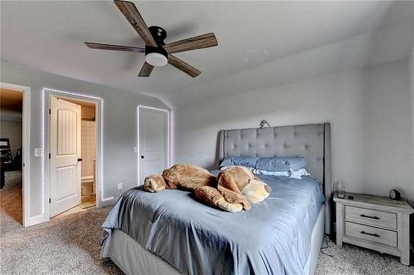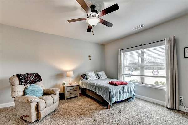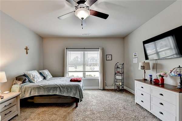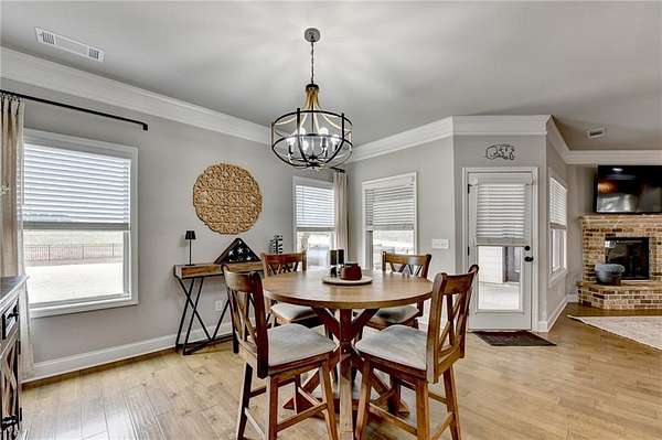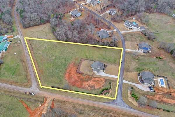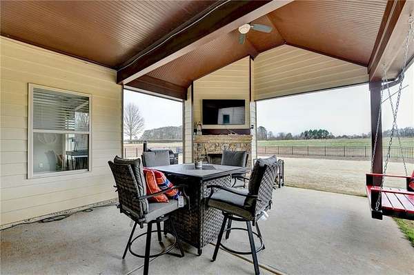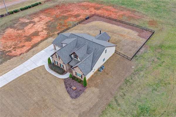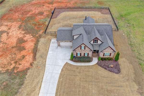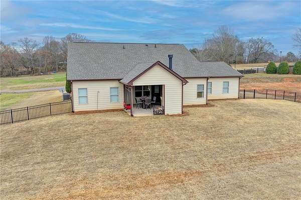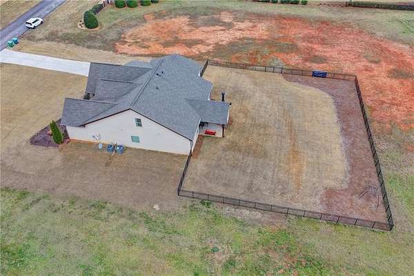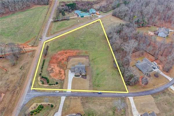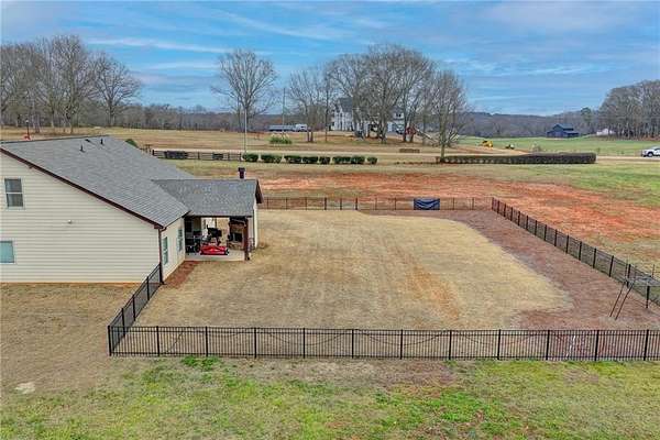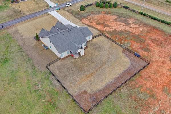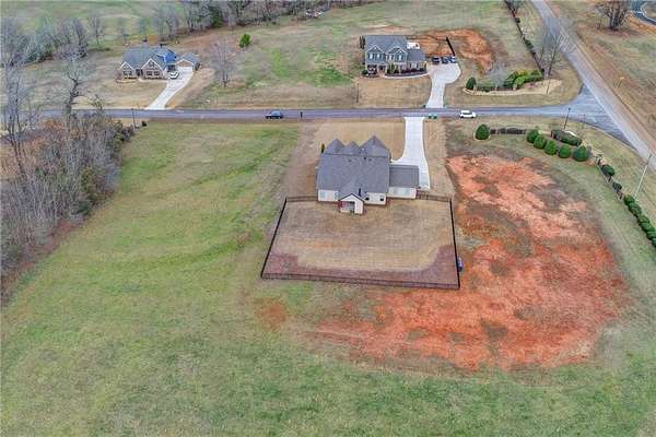 Welcome to your dream home, nestled on three spacious, level acres that offer both tranquility and room to grow. This stunning four-bedroom, three-and-a-half-bath home greets you with a beautiful brick entrance and a charming front porch, welcoming you and your guests into a warm, inviting space. Step inside the foyer, where a coat closet gives storage, and discover a welcoming great room complete with a cozy brick fireplace-ideal for cold winter evenings-and a ceiling fan to keep the room pleasant during summer months. The open layout flows naturally into the eat-in kitchen, where morning light fills the space and you can enjoy breakfast at the bar or dining table. White cabinets and hard-surface counters offer both style and durability, while the double oven makes hosting and cooking large meals effortless; a walk-in pantry provides ample storage for all your culinary needs. The oversized primary master suite on the first floor features a private entrance to a covered patio, bathing the room in natural light through generous windows and doors, and its ensuite bathroom invites relaxation with a soaking tub, hard-surface counters, and plentiful cabinets and drawers for every need. Secondary bedrooms are all spacious with include ensuites and equipped with storage, providing flexibility for children, guests, an office, or a workout room. The covered patio offers extended entertaining space, complete with an outdoor fireplace and a ceiling fan, perfect for gathering with friends and family in comfort. The expansive yard encourages creativity-imagine a pool, fire pit, garden, or any number of possibilities, all within your reach. Here, you'll appreciate the peaceful feel of rural living while enjoying the convenience of nearby highways, schools, and shopping, making everyday life both serene and accessible. This remarkable property is ready for you to make it your own, so bring your offer today and seize the opportunity to call this beautiful home yours-you won't want to miss it!