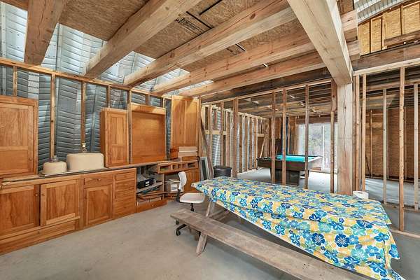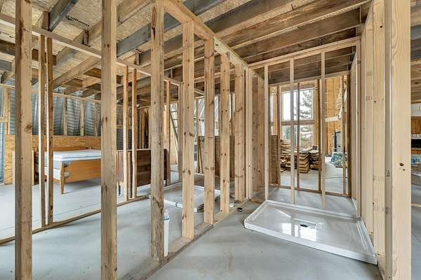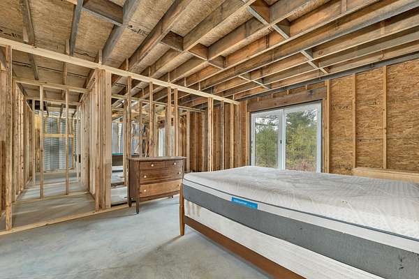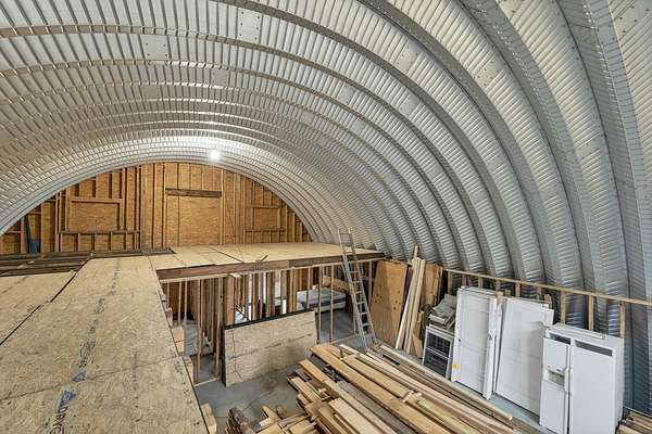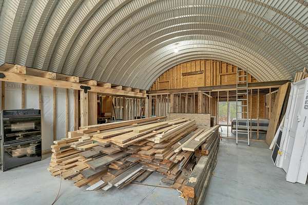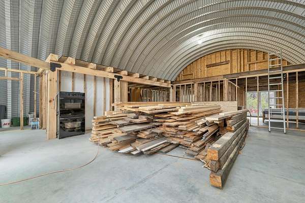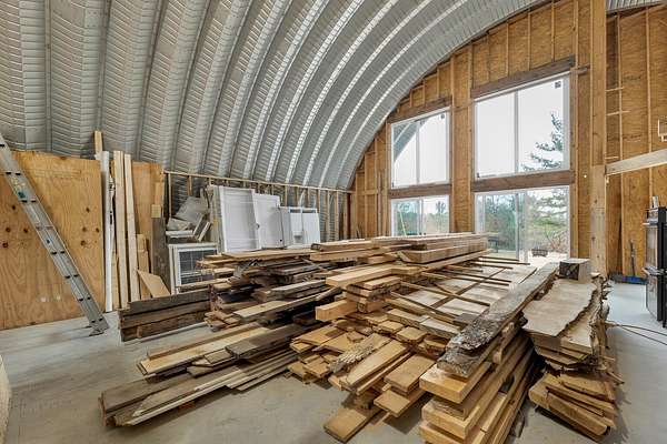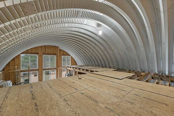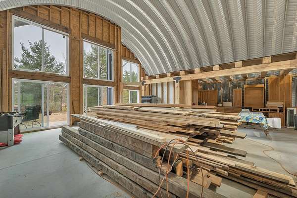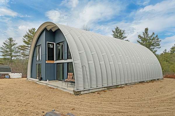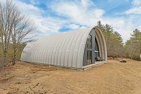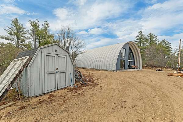 Experience a unique opportunity at 47 Hodgdon Road in Shapleigh. This striking Quonset hut-style residence offers a one-of-a-kind "handyman special," perfect for those looking to create a custom vacation getaway or a high-potential Airbnb. Currently 3/4 complete in construction, this home is a blank canvas ready for the final stages of your vision. The exterior features a durable, industrial-chic arched metal design situated on a solid concrete slab foundation. The property is nestled on a private lot with a cleared area that includes a storage shed for tools and outdoor gear. The lot connects to a series of recreation trails right at the end of the driveway and includes shared rights to a 120' private sandy beach on Square Pond. Inside, the home boasts expansive open-concept living with soaring high ceilings and an abundance of natural light provided by multiple large sliding glass doors and windows. The interior framing is largely in place, showing a thoughtful layout that includes a kitchen area already equipped with quality solid wood cabinetry. The bathroom is started with a vanity, toilet, and shower pan partially installed. A spacious loft area provides excellent potential for a primary suite or additional living space overlooking the main floor. This property is ready for its next owner to take over and complete the insulation, drywall, electric, and plumbing. Whether you are looking for a ruggedly stylish retreat in the heart of Maine's lake region or a unique investment property, 47 Hodgdon Road is full of potential and waiting for your finishing touches. Bring your tools and your imagination to this exceptional Shapleigh project! For more information or to schedule a showing, call The Zoeller Group or email