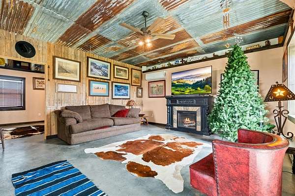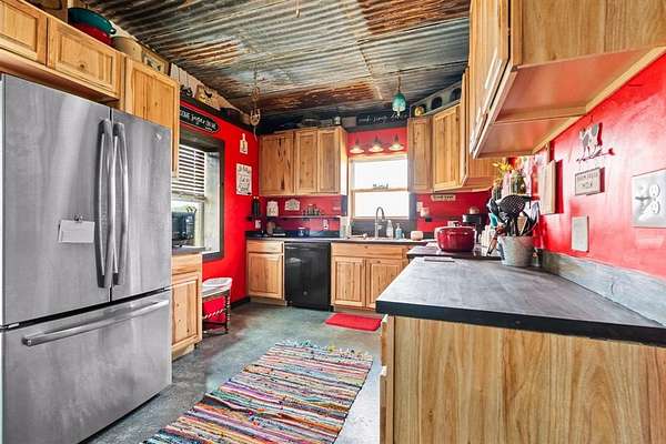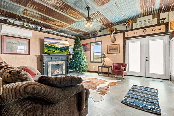 Escape to the country with this beautifully designed 17.371-acre property featuring a cozy 1 bed, 1 bath barndominium offering approximately 900 sq. ft. of living space. The open-concept layout showcases rustic charm with barn tin ceilings, sealed concrete floors, and a double vanity in the bathroom. It's fully electric and move-in ready!