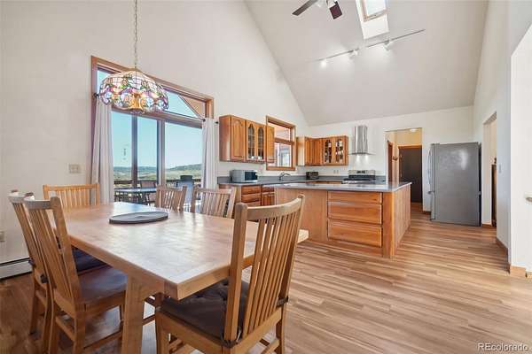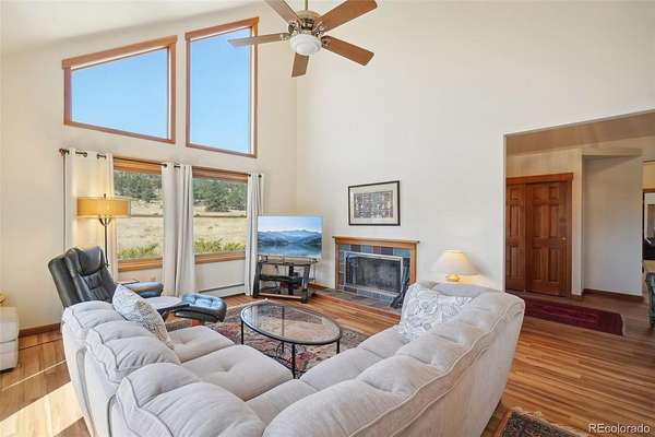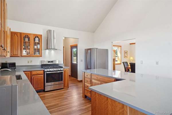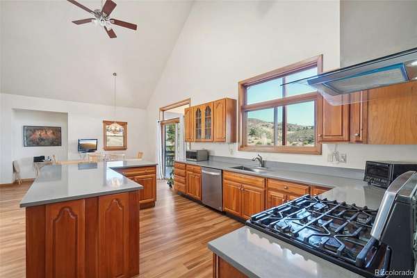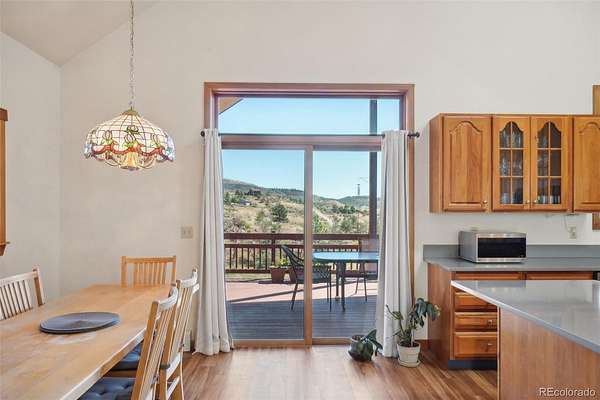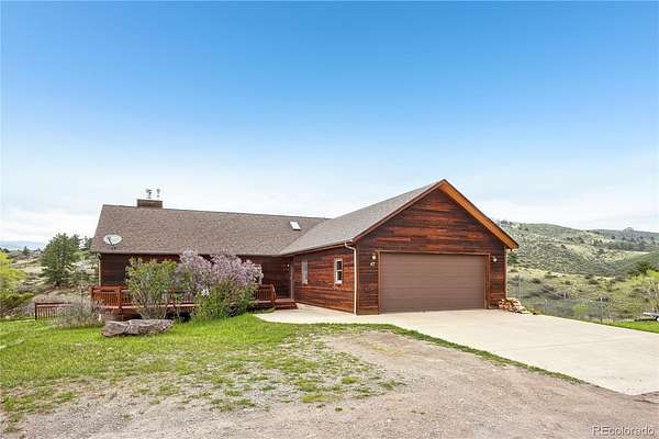 Beautiful Ranch-Style Foothills Retreat on Nearly 4 Acres! Experience the best of foothills living in this beautifully updated ranch-style home nestled on the floor of the Blue Mountain valley, offering nearly 4 acres of horse-zoned land and sweeping mountain views. *Brand new 50-gal water heater and newly serviced furnance! Complete with a well and fenced pasture, this property is ideal for equestrian lovers or those seeking wide-open space. Step inside to discover soaring vaulted ceilings, a cozy fireplace, and large windows that flood the living room with natural light and breathtaking scenery. The updated kitchen is a chef’s dream, featuring quartz countertops, a large island, stainless steel appliances, and a gas range. Just off the kitchen, the formal dining room is perfect for hosting, while the adjacent deck provides panoramic views—ideal for relaxing or entertaining. The main-level primary suite offers a private retreat with high ceilings, a walk-in closet, deck access, and a dedicated office nook. The ensuite bath boasts dual vanities and a luxurious soaking tub. A second bedroom, full bathroom, and convenient laundry area complete the main floor. Downstairs, the finished walk-out basement offers exceptional versatility, with a spacious family room, concrete patio access, and a workshop with kitchenette—perfect for rental income, multigenerational living, a guest suite, or a home office. Two additional bedrooms and another full bath ensure plenty of room for family or guests. All this, just 10 minutes from downtown Lyons—offering the perfect balance of peaceful country living and easy access to local amenities.