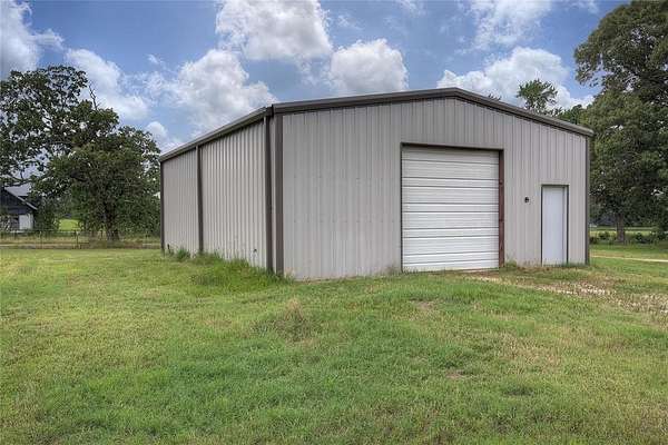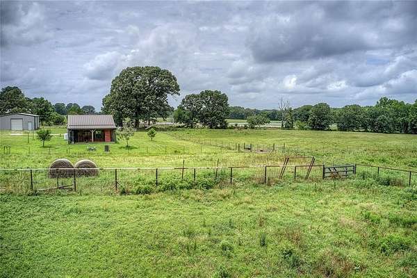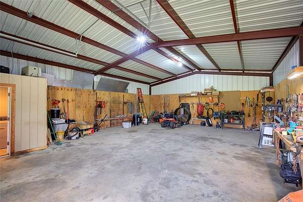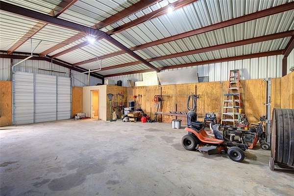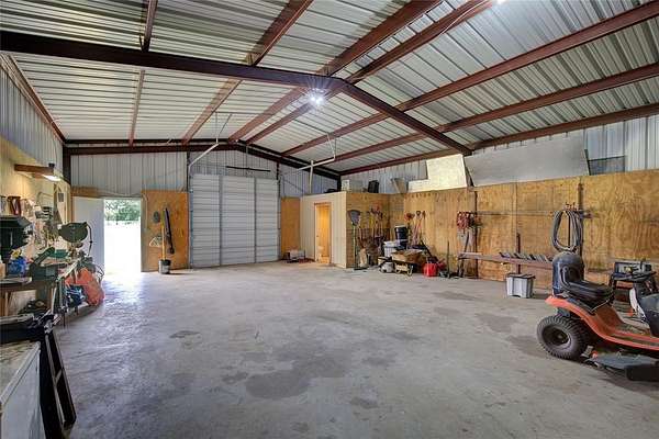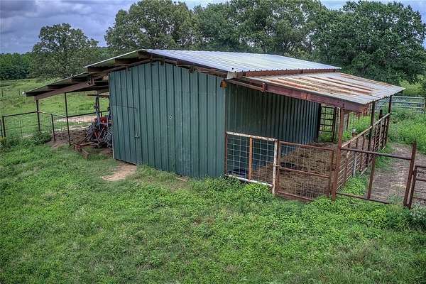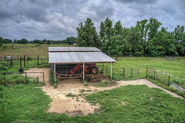 The land is thoughtfully improved with a large metal workshop equipped with two roll-up doors for easy access, a half-bath, and laundry facilities--perfect for projects, storage, or small business operations. A smaller barn sits nearby with an equipment storage overhang and several metal-rail-fenced pens, ready for animals, gardening, or expansion of your agricultural plans.