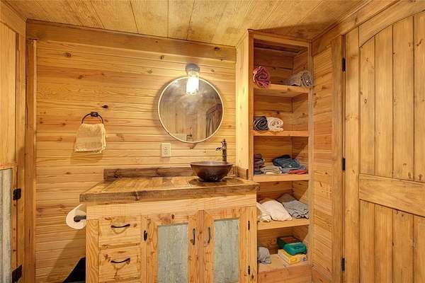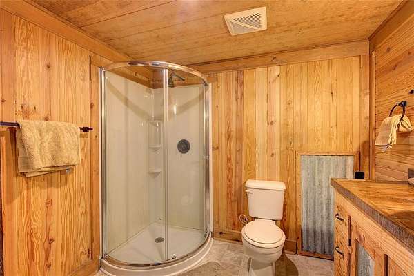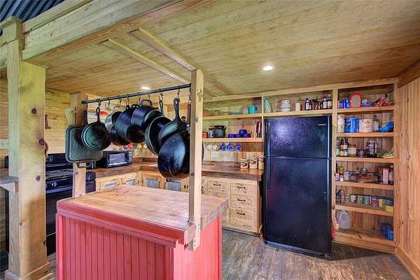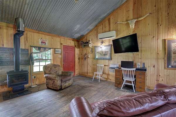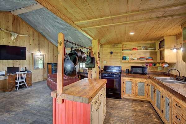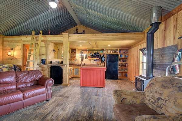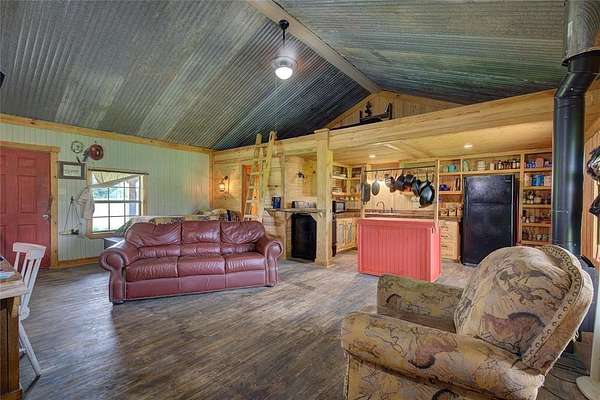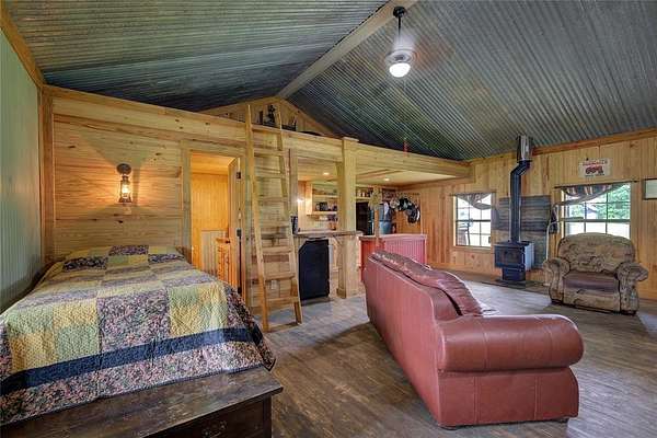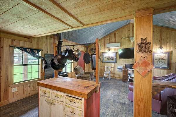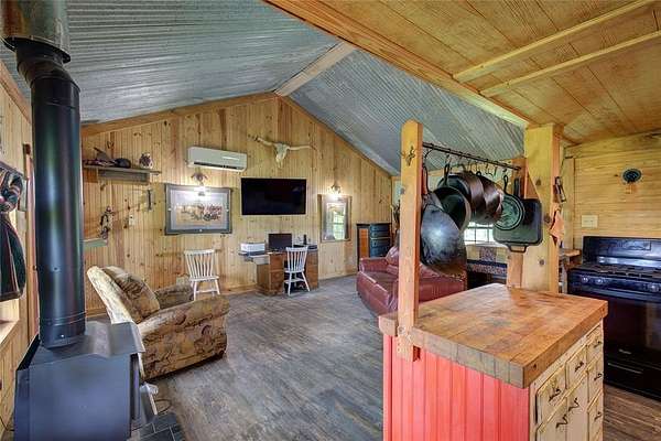 At the heart of the property is a cozy yet spacious cabin, ideal for weekend retreats, full-time living, or a guest home. The cabin features charming covered front and back porches where you can relax and take in the peaceful views. Step inside to an open floorplan that blends rustic warmth with practical comfort. Spacious living room is made comfortable by a mini-split for AC and heat, along with a wood-burning stove. Spray-foam insulation. The kitchen is both stylish and functional, with butcher block countertops, an island with a pot rack, and a small breakfast bar. A full bathroom includes a walk-in shower, vanity, and linen closet. A loft area provides additional sleeping or storage space.