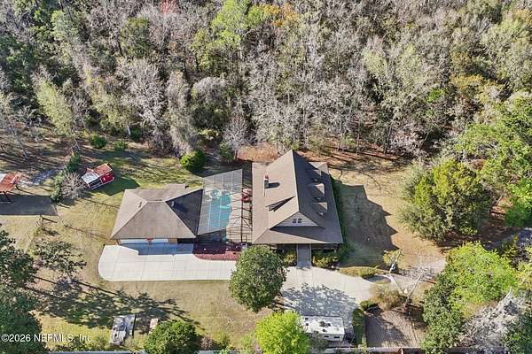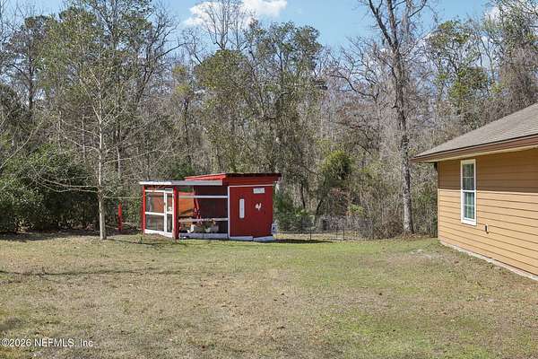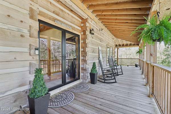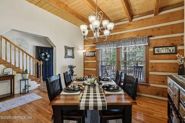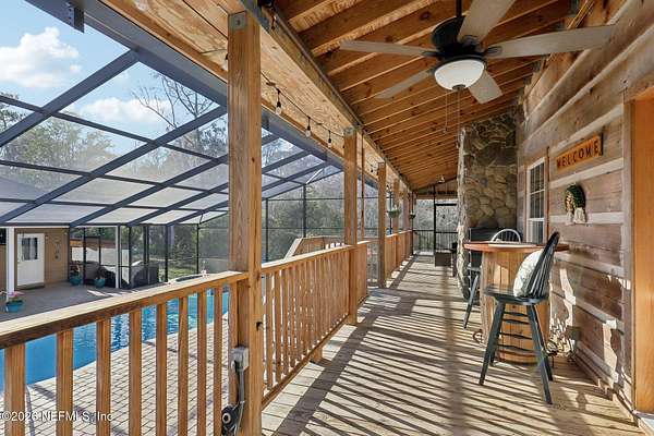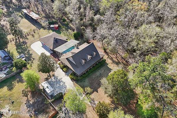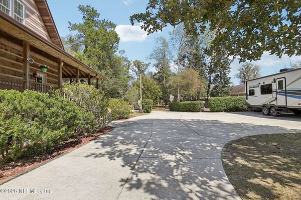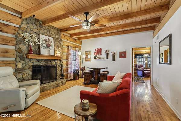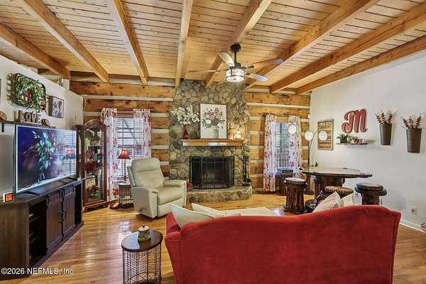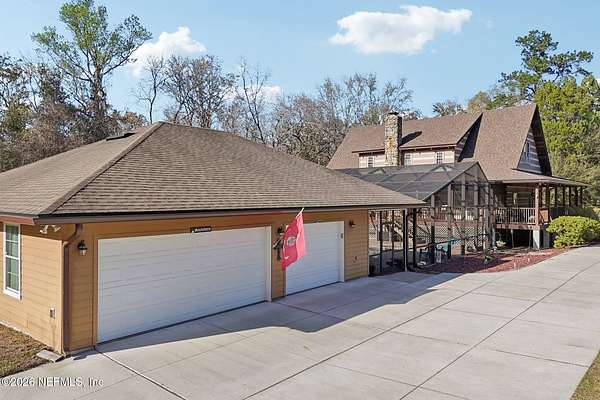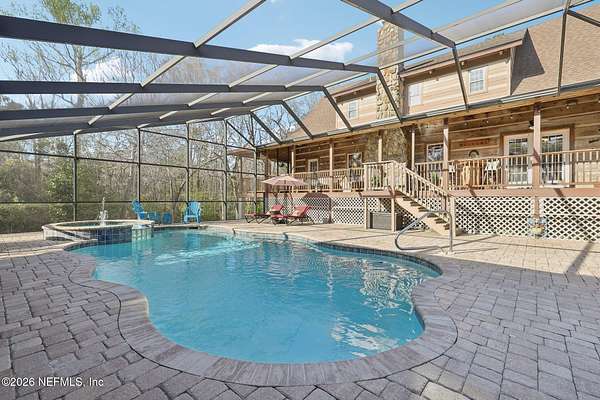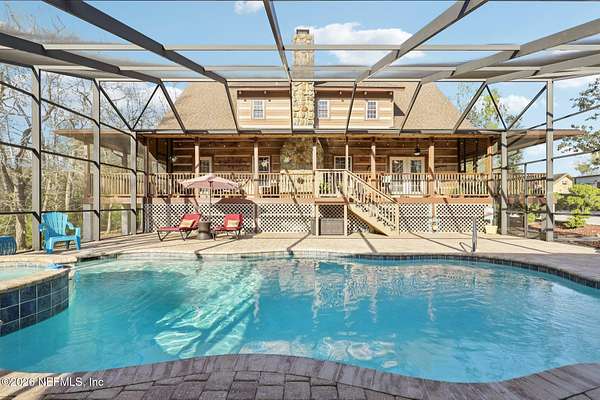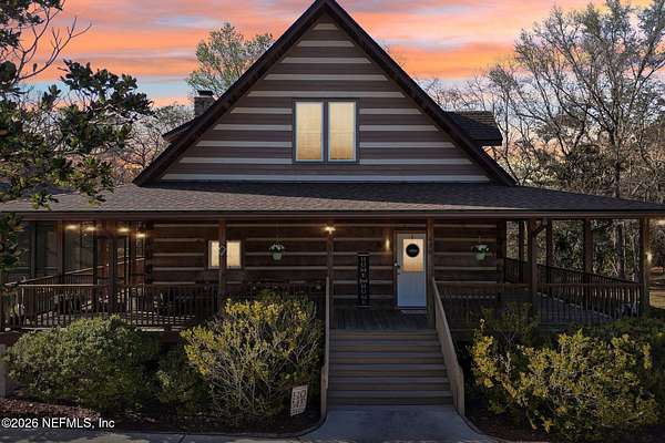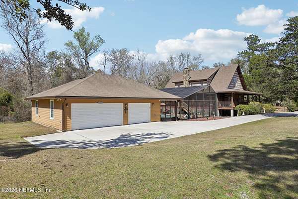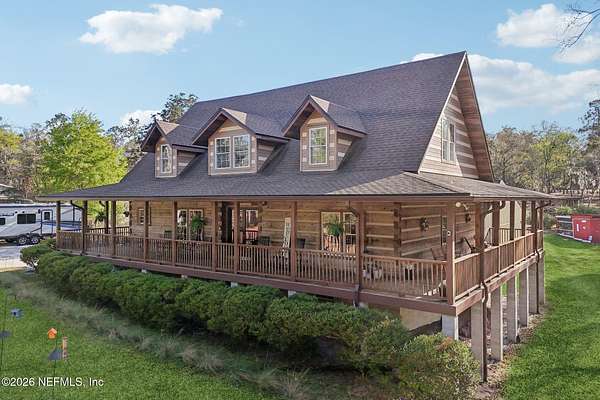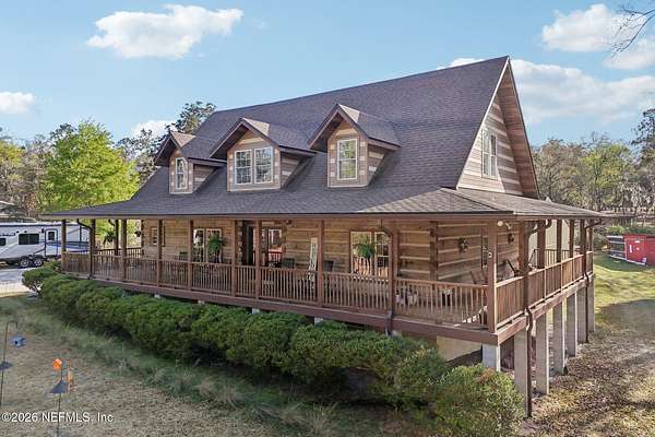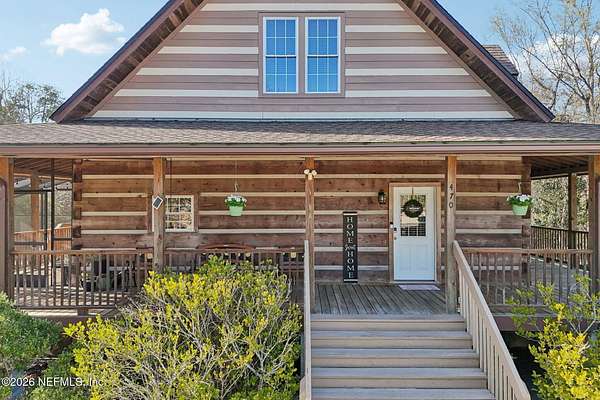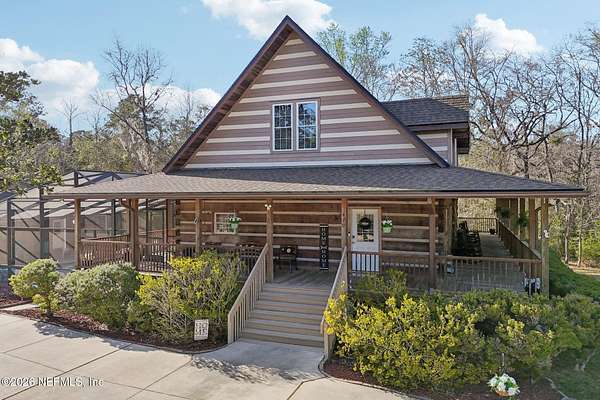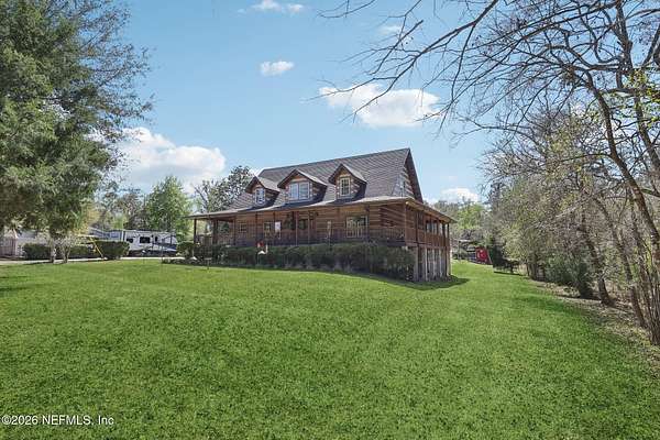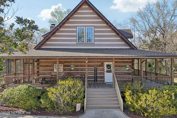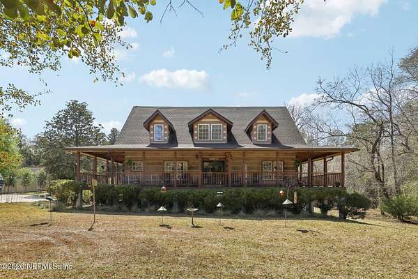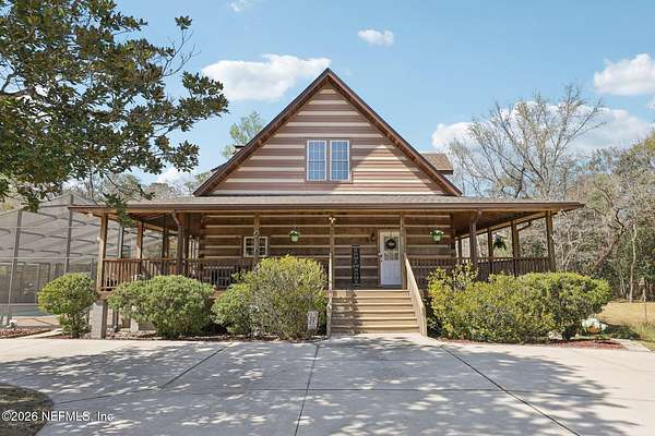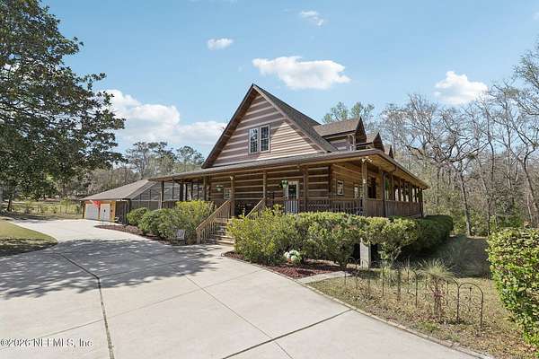 Welcome home to this charming 3 bedroom, 2 1/2 bath log cabin offering 2,618 square feet of warm, inviting living space on 2 beautiful acres - all tucked inside the Lake Asbury neighborhood with no HOA. A welcoming wraparound porch, complete with a porch swing, sets the tone for peaceful mornings and relaxing evenings. Step inside to find rich hardwood floors, soaring wood ceilings, and a formal dining room that is perfect for hosting gatherings. The spacious family room showcases a stunning wood-burning stone fireplace and flows seamlessly into the kitchen, where wood-look tile flooring, granite countertops, stainless steel appliances and a double oven make both everyday living and entertaining a breeze. Just off the kitchen, a convenient mudroom with a laundry area and full-size sink keep everything organized. The downstairs suite offers comfort and privacy, featuring a generous walk-in closet and an ensuite bath with double vanities and a walk-in shower. Upstairs, a large loft with a cozy window seat provides the perfect flex space, along with two additional bedrooms and a full bathroom. With two separate AC units for each floor, you'll enjoy efficient, customized comfort year-round. A functional basement adds exceptional storage plus a versatile area for a game room, home gym, or hobby space. Car enthusiasts or hobbyists will appreciate the impressive four-car garage, offering ample room for vehicles, tools, and toys. Outdoor living truly shines with a screened-in pavered patio and an in-ground pool - your private retreat for year-round enjoyment. The property also features a darling chicken coop, giving you the opportunity to enjoy farm-fresh eggs and a bit of homestead charm right in your own backyard. This cabin is filled with space, character, and tranquility - ready to welcome you home.