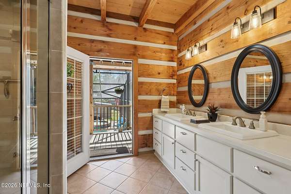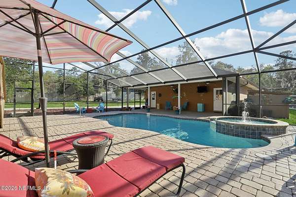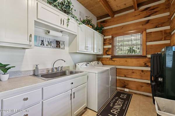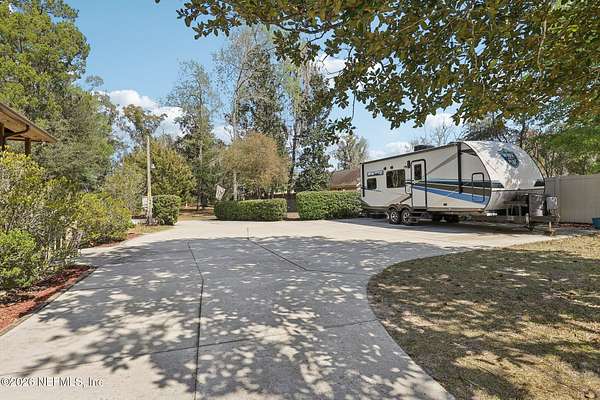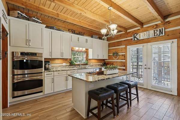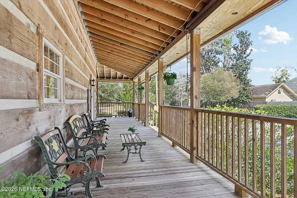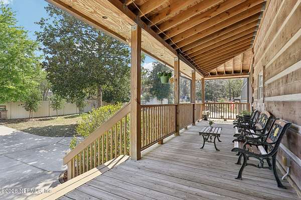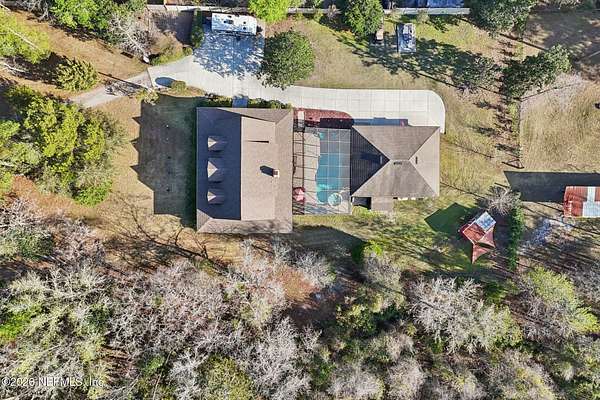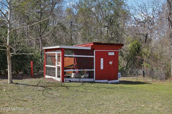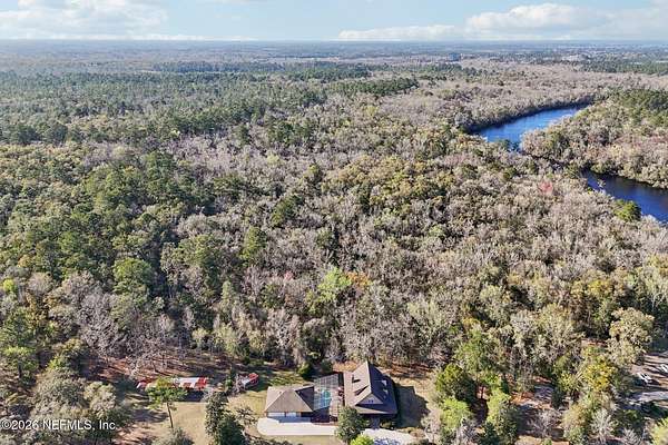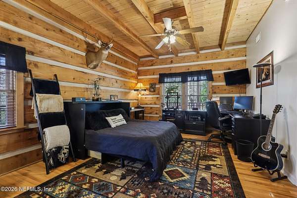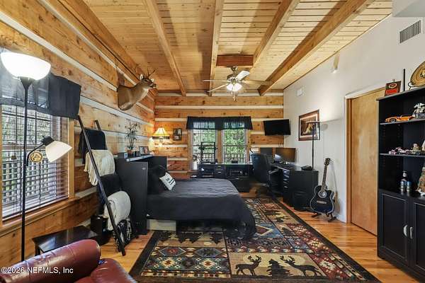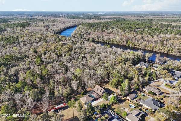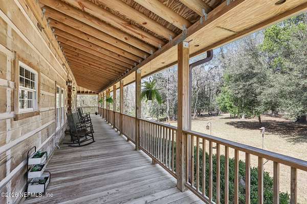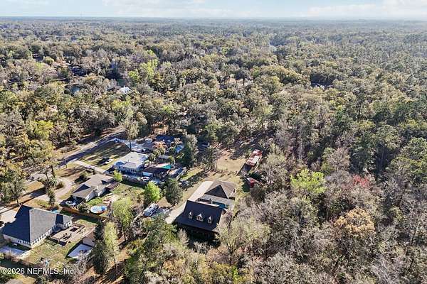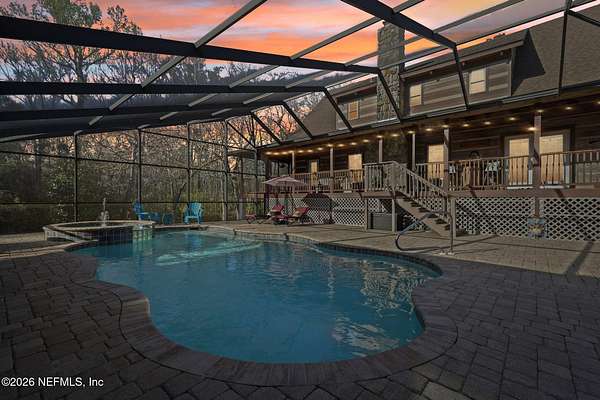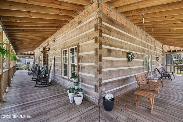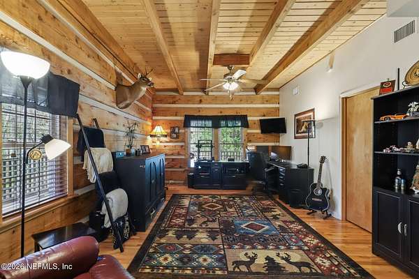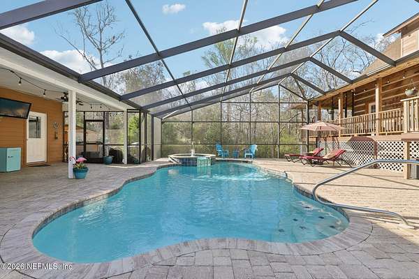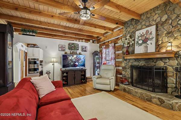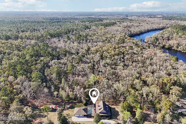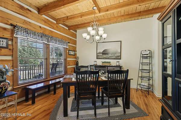 Welcome home to this charming 3 bedroom, 2 1/2 bath log cabin offering 2,618 square feet of warm, inviting living space on 2 beautiful acres - all tucked inside the Lake Asbury neighborhood with no HOA. A welcoming wraparound porch, complete with a porch swing, sets the tone for peaceful mornings and relaxing evenings. Step inside to find rich hardwood floors, soaring wood ceilings, and a formal dining room that is perfect for hosting gatherings. The spacious family room showcases a stunning wood-burning stone fireplace and flows seamlessly into the kitchen, where wood-look tile flooring, granite countertops, stainless steel appliances and a double oven make both everyday living and entertaining a breeze. Just off the kitchen, a convenient mudroom with a laundry area and full-size sink keep everything organized. The downstairs suite offers comfort and privacy, featuring a generous walk-in closet and an ensuite bath with double vanities and a walk-in shower. Upstairs, a large loft with a cozy window seat provides the perfect flex space, along with two additional bedrooms and a full bathroom. With two separate AC units for each floor, you'll enjoy efficient, customized comfort year-round. A functional basement adds exceptional storage plus a versatile area for a game room, home gym, or hobby space. Car enthusiasts or hobbyists will appreciate the impressive four-car garage, offering ample room for vehicles, tools, and toys. Outdoor living truly shines with a screened-in pavered patio and an in-ground pool - your private retreat for year-round enjoyment. The property also features a darling chicken coop, giving you the opportunity to enjoy farm-fresh eggs and a bit of homestead charm right in your own backyard. This cabin is filled with space, character, and tranquility - ready to welcome you home.
