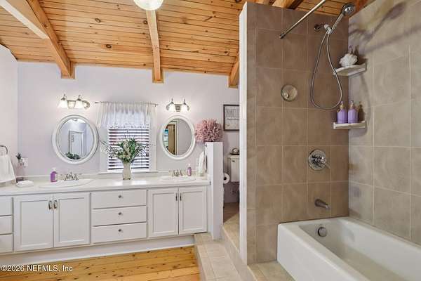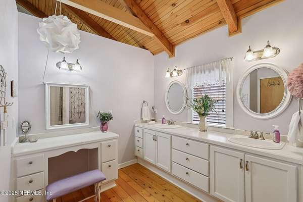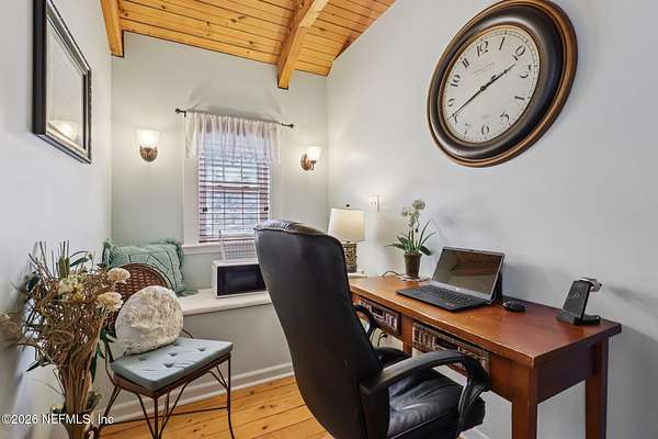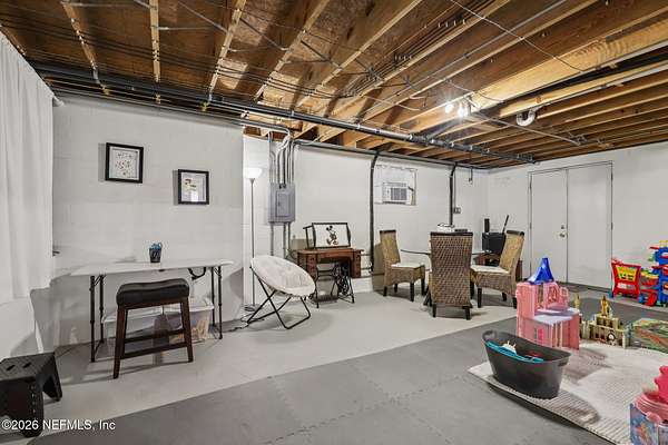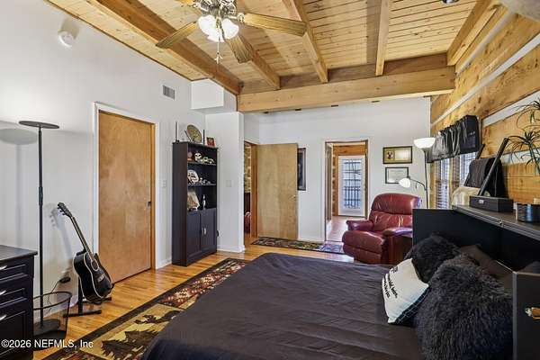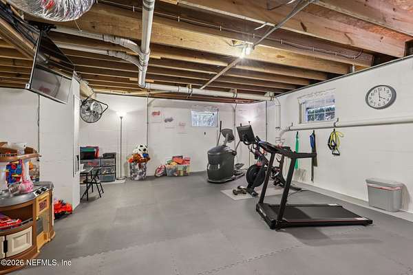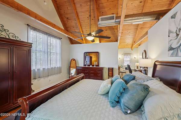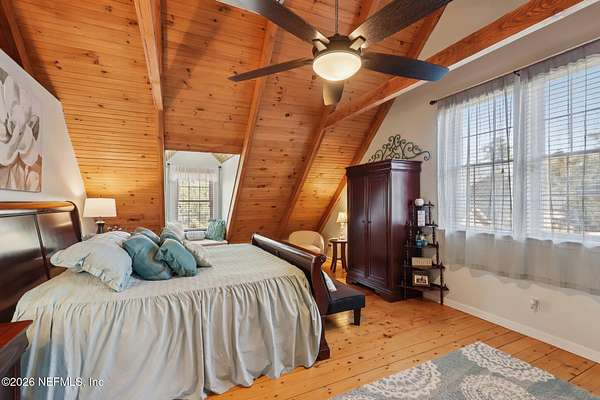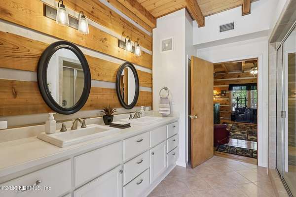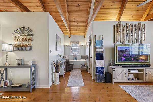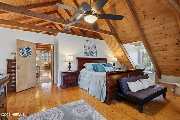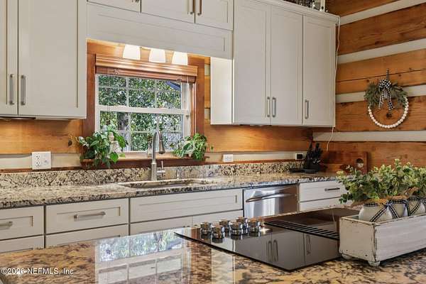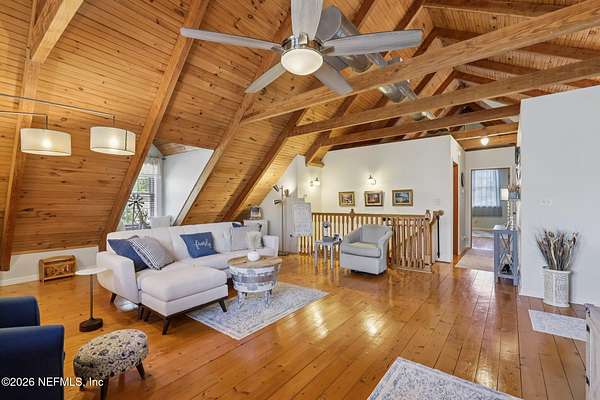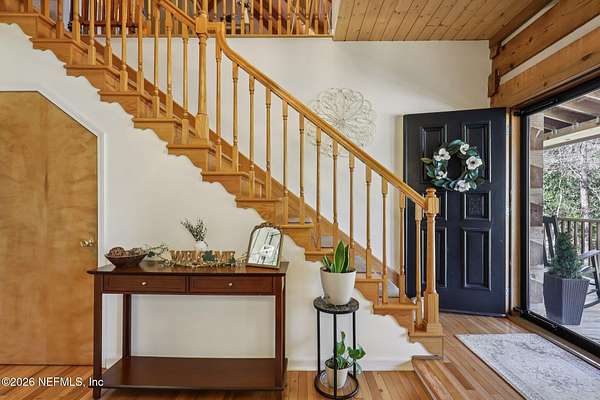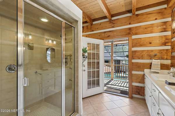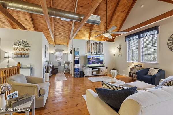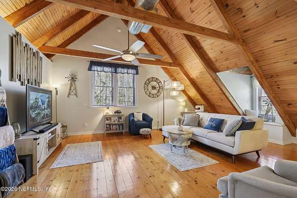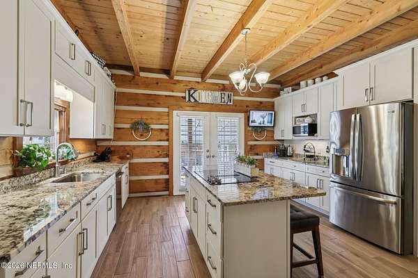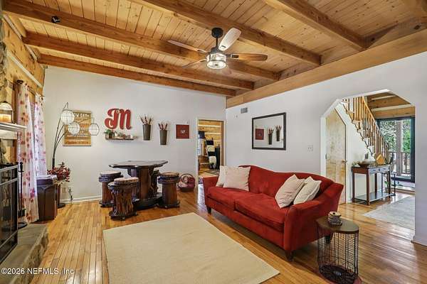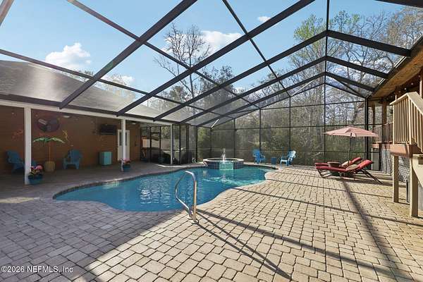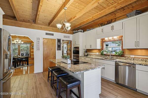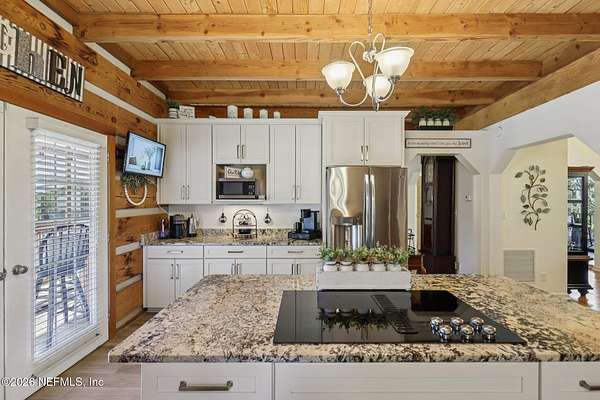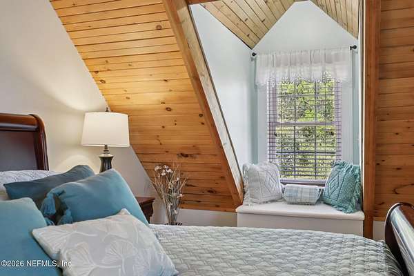Welcome home to this charming 3 bedroom, 2 1/2 bath log cabin offering 2,618 square feet of warm, inviting living space on 2 beautiful acres - all tucked inside the Lake Asbury neighborhood with no HOA. A welcoming wraparound porch, complete with a porch swing, sets the tone for peaceful mornings and relaxing evenings. Step inside to find rich hardwood floors, soaring wood ceilings, and a formal dining room that is perfect for hosting gatherings. The spacious family room showcases a stunning wood-burning stone fireplace and flows seamlessly into the kitchen, where wood-look tile flooring, granite countertops, stainless steel appliances and a double oven make both everyday living and entertaining a breeze. Just off the kitchen, a convenient mudroom with a laundry area and full-size sink keep everything organized. The downstairs suite offers comfort and privacy, featuring a generous walk-in closet and an ensuite bath with double vanities and a walk-in shower. Upstairs, a large loft with a cozy window seat provides the perfect flex space, along with two additional bedrooms and a full bathroom. With two separate AC units for each floor, you'll enjoy efficient, customized comfort year-round. A functional basement adds exceptional storage plus a versatile area for a game room, home gym, or hobby space. Car enthusiasts or hobbyists will appreciate the impressive four-car garage, offering ample room for vehicles, tools, and toys. Outdoor living truly shines with a screened-in pavered patio and an in-ground pool - your private retreat for year-round enjoyment. The property also features a darling chicken coop, giving you the opportunity to enjoy farm-fresh eggs and a bit of homestead charm right in your own backyard. This cabin is filled with space, character, and tranquility - ready to welcome you home.