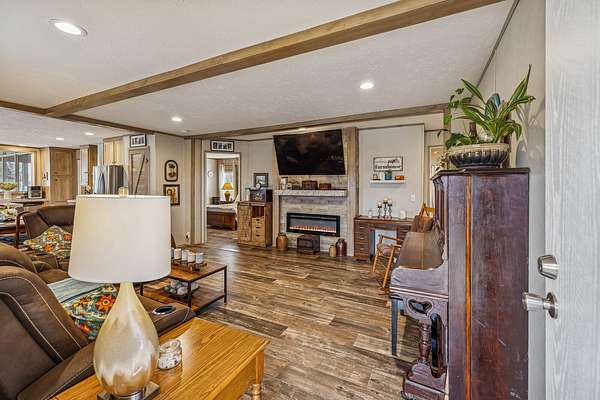 Set on 5.12 acres in Bethpage, TN, this 3-bedroom, 2-bath manufactured home offers 1,285 square feet of comfortable living surrounded by peaceful countryside, complete with a barn for added functionality. Step inside to a welcoming living room featuring exposed beams and a cozy fireplace, creating a warm, rustic feel from the moment you enter. The kitchen is equipped with stainless steel appliances, hardwood cabinetry, and a small island for extra prep space, while large windows over the sink bring in natural light. The primary bedroom includes a stylish wood accent wall and an en-suite bathroom with a dual vanity, built-in storage, and a walk-in shower. A dedicated laundry room provides additional storage and convenience. Enjoy the outdoors from the screened-in deck, perfect for relaxing while taking in the quiet surroundings. The barn adds versatility for hobbies or storage, making this property ideal for those seeking space and flexibility. Up to 1% lender credit on the loan amount when buyer uses Seller's Preferred Lender.
