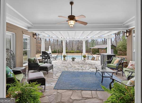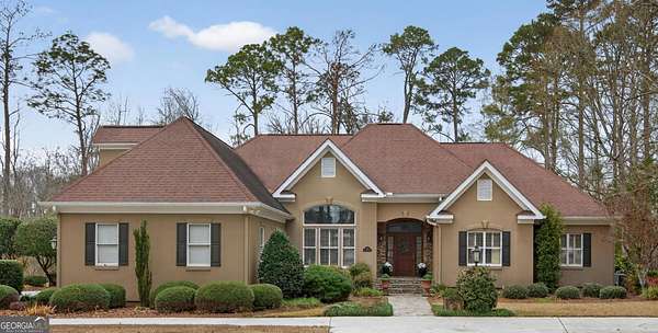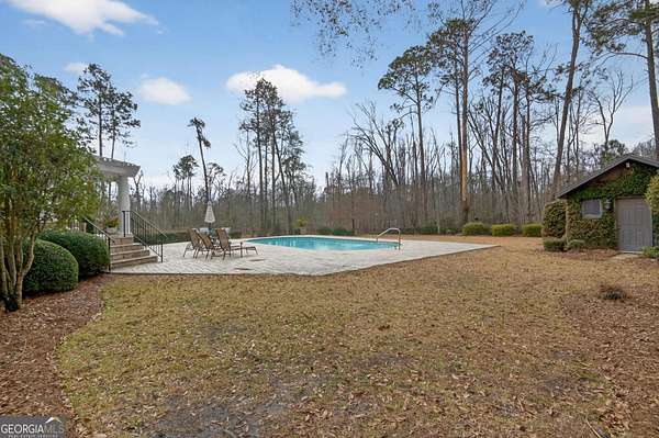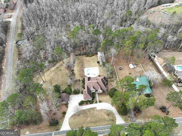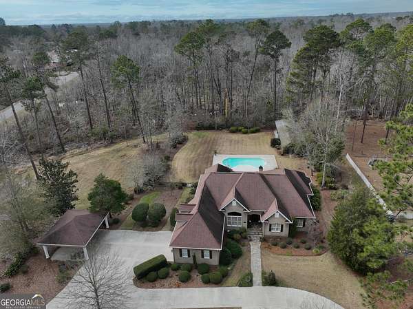 A timeless Southern Living masterpiece, this exquisite custom home-built in 1995-rests on three adjoining lots totaling 4.16 acres, offering privacy, elegance, and gracious entertaining spaces throughout. The corner lot is enhanced by a serene wooded backdrop along the south side and rear of the property beyond the fence, creating a picturesque, estate-like setting. A circular driveway provides effortless guest access, complemented by an attached two-car garage and an additional two-car carport conveniently located across from the garage. Step inside to a spacious and thoughtfully designed main level, where the foyer opens seamlessly into a welcoming living and dining room combination, creating an inviting first impression filled with warmth and natural light. The chef's kitchen features stainless steel appliances, a center island with seating, cabinetry with pull-out drawers, and a walk-in pantry. Adjacent to the kitchen is ample space for casual dining, flowing beautifully into a sun-drenched, cozy sunroom - perfect for morning coffee or relaxed gatherings. The primary ensuite is a private retreat, complete with a sitting area and a luxurious bath featuring double vanities, a tiled walk-in shower, soaking tub, private commode, and two walk-in closets. An additional main-level bedroom with a full adjoining bath also connects to a refined library/office, offering flexibility for guests or work-from-home living. Throughout the main floor, plantation shutters, custom window treatments, elegant moldings, and built-in bookcases flanking the fireplace showcase craftsmanship and classic Southern charm. Upstairs, you'll find two spacious bedrooms, two full baths, abundant attic storage, and a dedicated workout room connected to the attic space. Outdoor living is nothing short of spectacular. The beautifully landscaped, fully fenced backyard features an in-ground pool surrounded by paver brick, a covered patio and veranda with pergola, round columns, and wrought iron handrails-ideal for entertaining or peaceful relaxation. Completing the property is a large workshop and an additional attached outdoor building, offering endless possibilities. This move-in ready home blends refined Southern elegance with modern comfort-truly a property worthy of Architectural Digest photography.