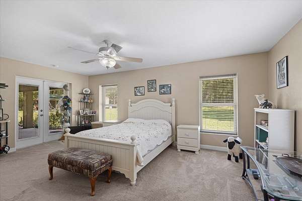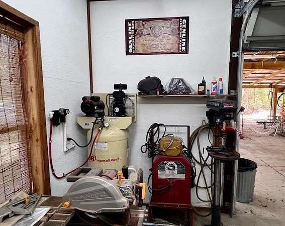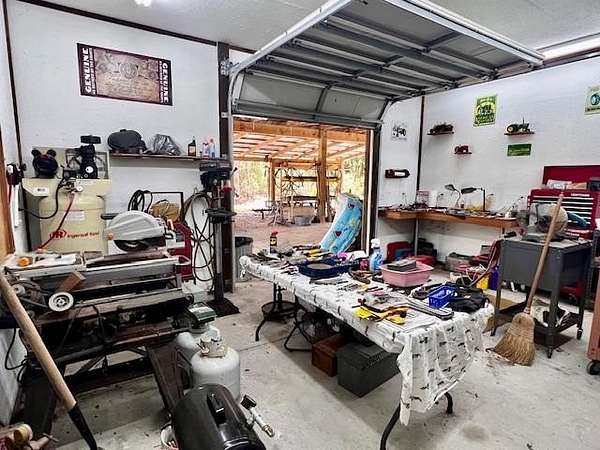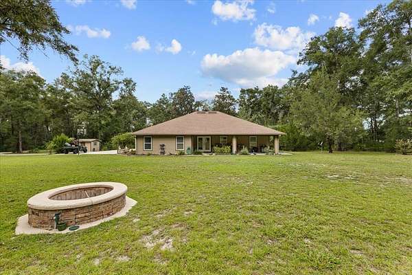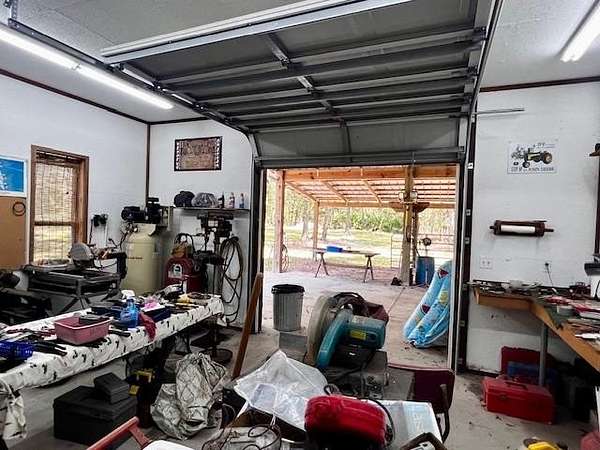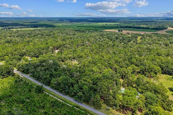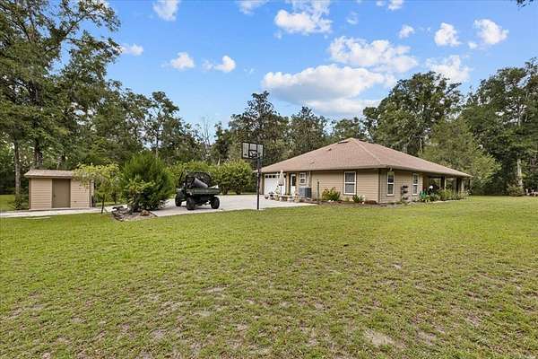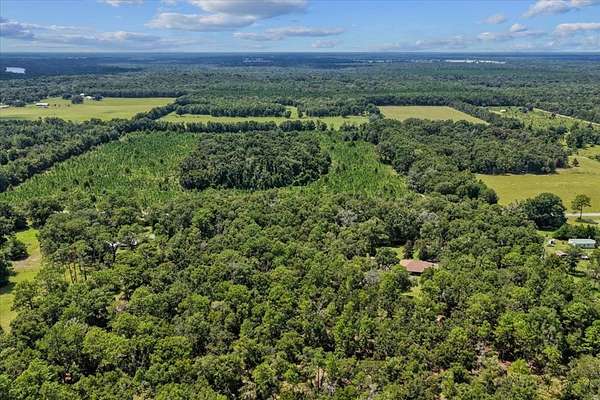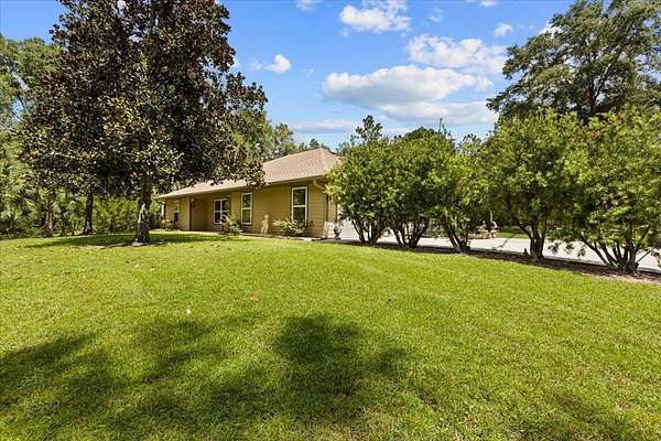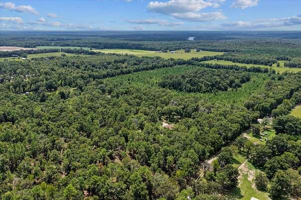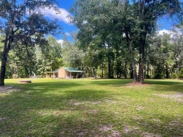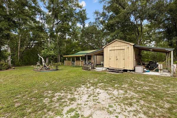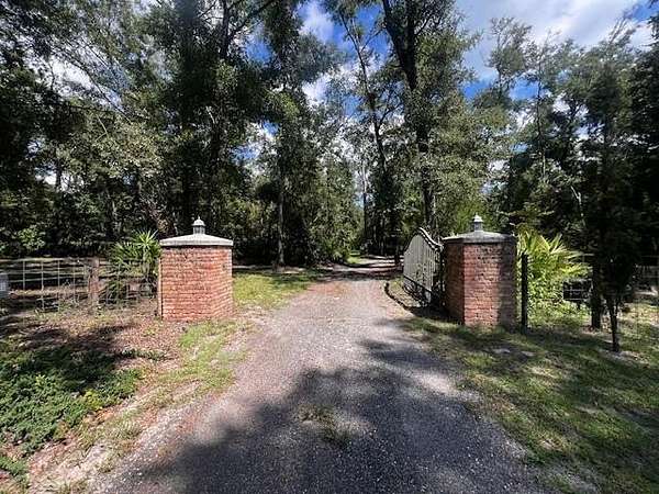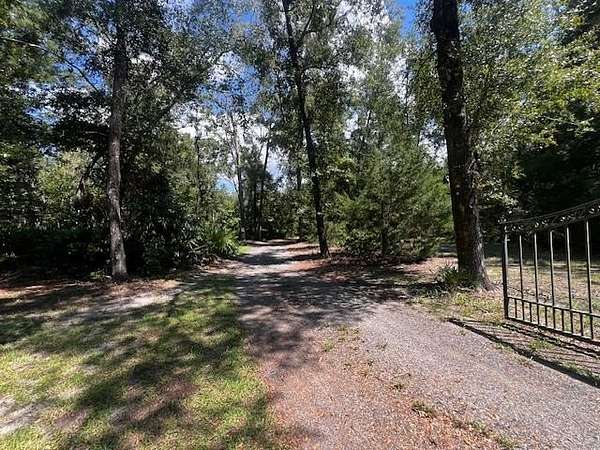 PRIVACY and BEAUTY abound at this 9.39 ACRES on a PAVED road just north of Bell, in the Rock Bluff area. Enter the property thru a brick column, iron gate driveway that winds to the custom 3 BD/2 BA CONCRETE BLOCK home also has hardiplank siding making it stronger and giving better insulation. The spacious home boasts 1,441 SF of living area and has a large covered back porch and attached garage, making 2,322 SF under roof. The split plan home offers 2 large bedrooms on one end of the home with bathroom between that has a 1920 antique pedestal sink. The Master Bedroom, with a private french door access to the back porch, has a nice walk-in closet and master bath with double sink vanity and walk in shower. The open concept living, dining, kitchen area is light and bright! The kitchen has an abundance of cherry wood cabinets and a prep sink, in addition to the double sink. The Corian countertops are maintenance free and durable. There is a pantry closet, next to the laundry closet, for added storage. A pleasant surprise at this property are the added buildings outside! A 12'x20' GUEST COTTAGE/"SHE SHED" is cute as can be with its front porch! A small kitchen area and bathroom and open living/sleeping area make it so convenient for guests. Another utility building with 2 wings is great storage for almost anything! In addition, there is another LARGE 36'x44' POLE BARN with concrete floor and includes a 15'x18' WORKSHOP. There is an air compressor installed and piping runs throughout the barn and workshop. Another 12'x36' wing of this pole barn has limerock floor. Toward the back of the property, yet another pole barn (16'x20') is situated for parking boats, trailers, or any other items you may need to store. The owner has taken meticulous care of the property. Upgrades include a new HVAC unit June 2025, water system 2024, gutters added 2020. Call to set up your private tour today!