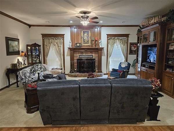 Choctaw Beauty! 5 acres(mol) plus workshop! Spacious 3,468 square feet(mol). Gated with wrought iron and pipe & cable fencing. Well kept home 4 or 5 bedrooms, 2 1/2 baths, 2 living areas, 2 dining areas plus a study(optional 5th bedroom). Nice living room with raised ceilings, crown moldings plus fireplace w/pellet insert. Large game room with a bathroom and refreshment area. Kitchen features include quality oak cabinetry, quartz counter tops, built-in appliances, eating space plus a pantry. Master suite is quite spacious and will easily accommodate king sized furniture. Master suite also features double vanities, whirlpool tub, separate shower and a large walk-in closet. Nice inside utility room with great storage and counter space plus a sink. Exterior features include scenic rolling landscape, 30 x 40 workshop, additional out buildings, plus a spacious covered back patio with remote control screen enclosure. Other features include a garage floor storm shelter & GENERAC Generator.