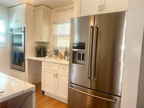 Inside, you'll find gleaming hardwood floors, vinyl windows that welcome abundant natural light, and a cozy fireplace that sets the tone for warm gatherings. The updated kitchen features granite countertops, stainless steel appliances, and stylish cabinetry, making everyday living as effortless as it is elegant.