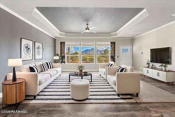 Nestled at the tranquil end of the road, this inviting home sits on two beautifully landscaped acres and offers a harmonious blend of comfort and style with an OWNED solar system. Step inside todiscover large, sun-filled rooms adorned with modern colors, and a striking cove ceiling in the living room that adds a touch of elegance. The thoughtful layout includes ahidden pantry for extra convenience and storage. Outside, enjoy stunning views and the peace of mind provided by sturdy rail pipe perimeter fencing. A roomy two-car carport shelters your vehicles, while the expansive driveway ensures ample parking for residents and guests alike. This property is perfect for those seeking spacious living, modern touches, and a serene environment to call home.