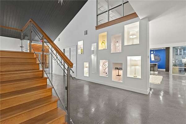 Exceptional commercial property offering over 28,000 sq ft across two impressive buildings on 4.54 acres. The main 20,000 sq ft building showcases a breathtaking 13,500 sq ft modern showroom and office space-undeniably one of the most striking in the region-featuring designer kitchens with custom cabinetry and top-of-the-line finishes throughout. Continuous power access with outlets spaced every few inches around the entire perimeter of both showroom levels, ensuring maximum versatility for displays and operations. Every office is thoughtfully designed with elegant built-in cabinetry, creating a refined and highly functional workspace. An additional 6,500 sq ft of well-organized warehouse space with extensive shelving adds valuable utility. The second structure provides 8,500+ sq ft of flexible warehouse space, perfect for storage, expansion, or a wide range of business uses. A rare and remarkable opportunity with endless potential-this property truly must be seen to be appreciated.
