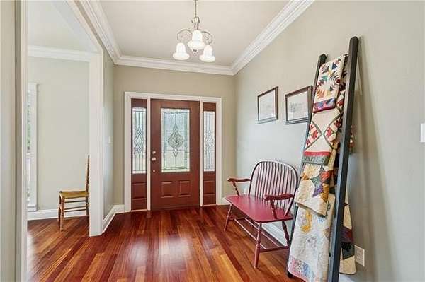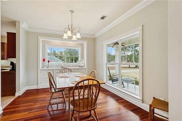 Tucked away on a beautiful two-acre lot, this exquisite brick home offers a classic front porch framed by mature landscaping. Inside you will find wood flooring, tall ceilings, crown molding, and a stunning stone fireplace that creates a warm and inviting atmosphere. The kitchen is spacious and beautifully kept with custom cabinetry, generous counter space, a large island, and plenty of room for family gatherings. The extra large primary suite features dual vanities, a soaking tub, separate shower, and abundant storage. The additional bedrooms are generously sized and thoughtfully laid out, each offering comfort, charm, and ample closet space.