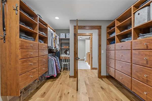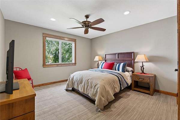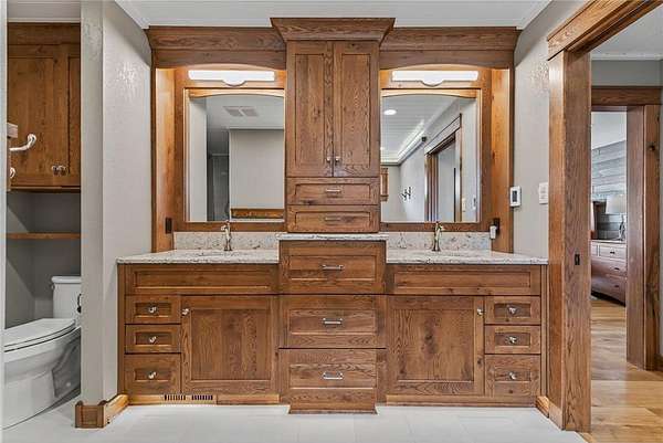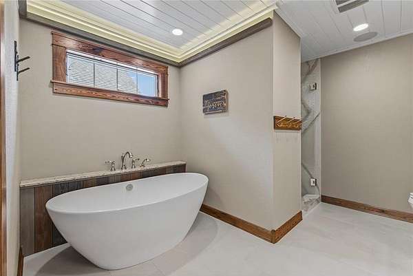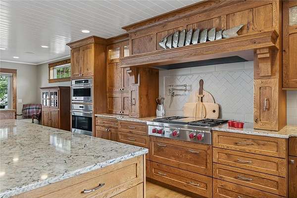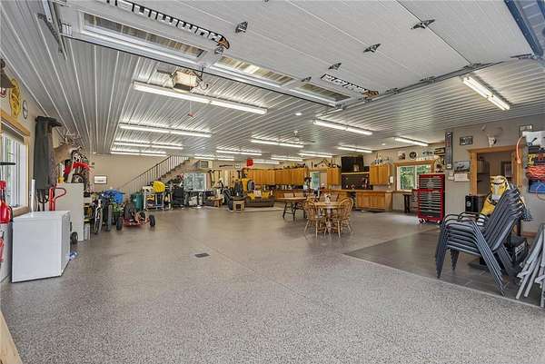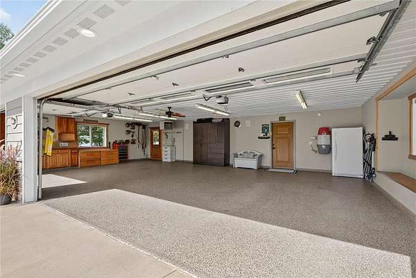 Upstairs, a sunlit loft and two generously sized bedrooms share a full bathroom with a tub and rain shower, offering comfort and style. Outside, expansive patios host an outdoor kitchen and a built-in firepit, leading seamlessly to a large dock and pristine private sandy beach. Enhancing this extraordinary lakefront estate, a 2,700-square-foot custom workshop features in-floor heating, versatile upper-level spaces for hobbies or recreation, and a detached 24-by-24 garage, providing both function and sophistication.