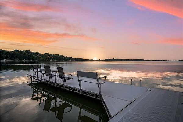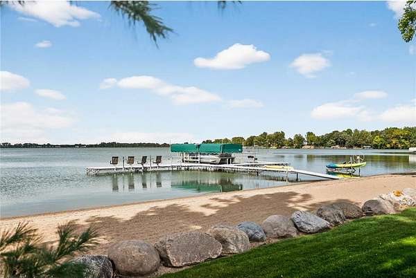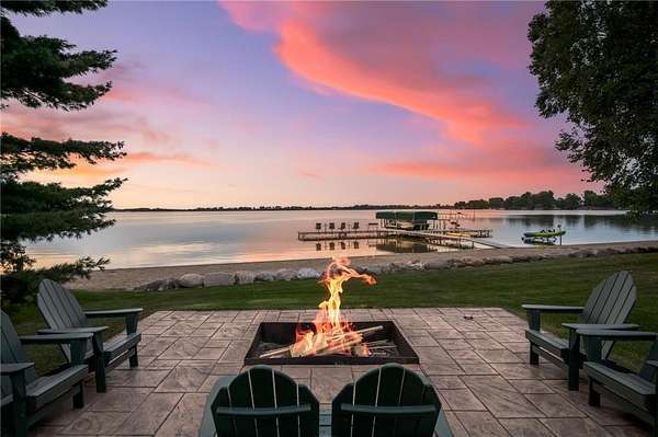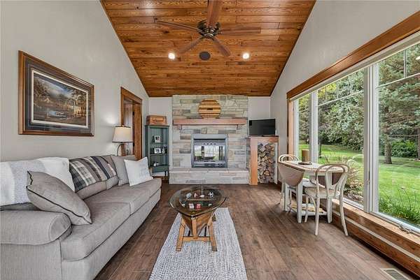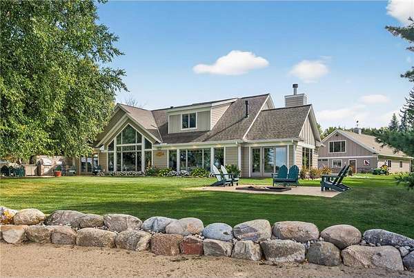 This stunning three-bedroom, three-bathroom home on German Lake is a rare retreat, set on 5.4 acres with 135 feet of private sandy shoreline. Thoughtfully designed, it offers an open-concept layout that captures breathtaking lake views and sunsets. Exquisite custom woodwork, Andersen windows, built-in speakers, and motorized shades create effortless comfort throughout. The living room impresses with a 15-foot vaulted ceiling, floor-to-ceiling windows, rustic white oak flooring, and a stone-surround gas fireplace, seamlessly flowing to the dining area and patio for effortless indoor-outdoor entertaining.