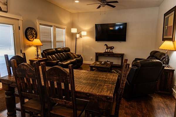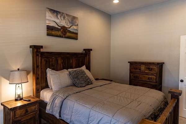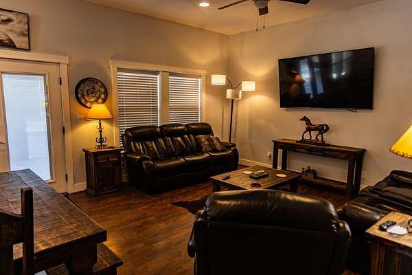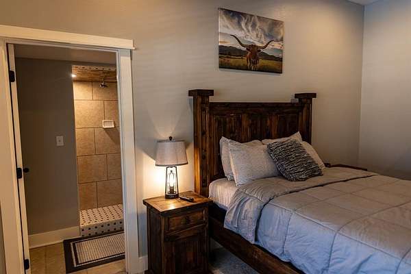 Currently operating as a successful bed and breakfast, the main building features four spacious guest bedrooms and four full bathrooms, along with a welcoming kitchen and comfortable living and dining areas designed to create an inviting atmosphere for guests. A charming front porch provides an ideal place to relax and enjoy the peaceful surroundings.