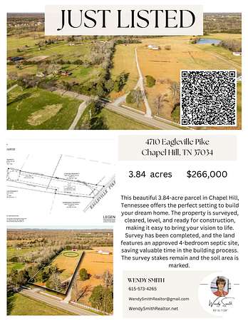 This beautiful 3.84-acre parcel in Chapel Hill, Tennessee offers the perfect setting to build your dream home. The property is surveyed, cleared, level, and ready for construction, making it easy to bring your vision to life. The Minor Division Survey has been completed, and the land features an approved 4-bedroom septic site, saving valuable time in the building process. With plenty of space for a custom home and outdoor living. This tract provides an ideal balance of peaceful country living while remaining convenient to nearby amenities. Bring your home plans and start building the lifestyle you’ve been dreaming of. The property is staked and the soil site is marked. The horse run-in shown in the photos is not part of this parcel. The property stops just short of it.