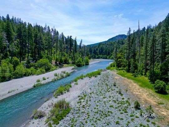 From Highway 3, take Hyampom Road. Left on Lower South Fork Road. Property is on the left, past the Hyampom Mill and Mill Creek. Look for RE Signs