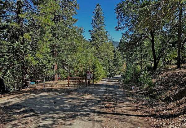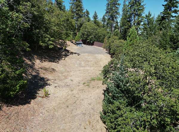 The 2.15-acre hillside parcel has already undergone extensive excavation and improvement work. A gated gravel driveway leads into the private setting, where partial mountain views peek through mature evergreens and wildlife such as deer, wild turkeys, quail, and other native species are frequent visitors.