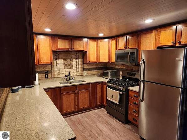 Welcome to your Up North escape with the perfect blend of comfort, charm, and space to roam. This 3-bedroom, 1-bath ranch-style home sits on a beautiful 3.82-acre parcel, offering privacy and room to enjoy the outdoors—all conveniently located on a paved, county-maintained road in Kalkaska County. Step inside and you’ll immediately feel the warm, modern cabin aesthetic. The kitchen is a standout feature, showcasing rich cherry cabinetry, stainless steel appliances, and granite countertops—ideal for both everyday living and entertaining. The home is efficiently heated with hot water baseboard heat, complemented by a cozy wood-burning stove that adds both warmth and rustic character during the colder months. Outside, the property continues to impress. A spacious attached garage provides convenience year-round, while the 20x30 two-story barn offers incredible versatility—perfect for storage, hobbies, a workshop, or even future creative space. Whether you're looking for a year-round residence, a northern Michigan getaway, or a property with room to grow, this one checks all the boxes. Don’t miss your chance to own a slice of country living with modern comfort.