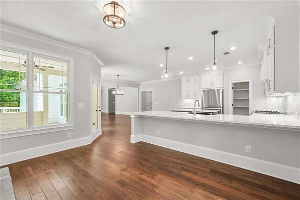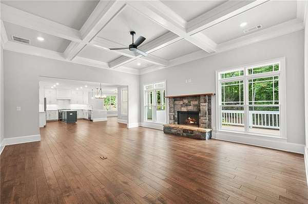 As you step into this home, you are greeted by hardwood floors and stylish lighting that illuminate the neutral colors of the open floor plan. The inviting living spaces bask in an abundance of natural light and benefit from featured fireplaces for a warm, cozy ambiance.