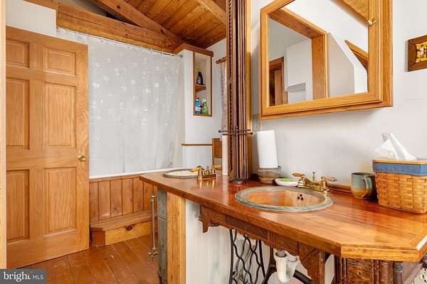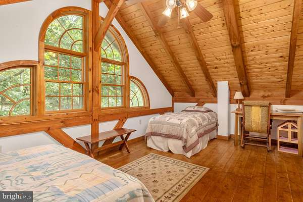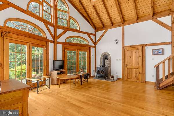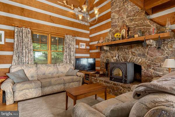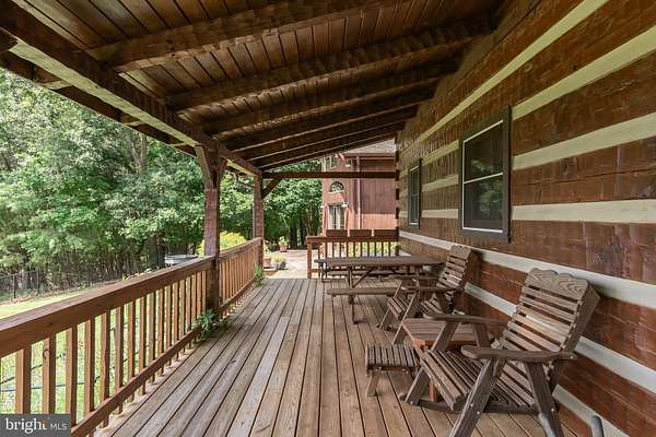 Log & Contemporary Styled Home nestled on 49 secluded acres, a nature lover's retreat! Property consists of 5 parcels lightly wooded with back porch view all the way to VA. Step inside this 4 bedroom, 3 bath home with natural wood floors, doors, and trim throughout, creating a warm, inviting atmosphere. Love those cathedral ceilings and exposed beams throughout. The living room features a stunning stone fireplace, ideal for cozy evenings. An expansive addition includes a two-story great room with cathedral ceilings and a gas stove, offering ample space for gatherings. Eat-in kitchen with beamed ceilings, fully equipped with all appliances. Upstairs, a delightful loft overlooks the great room-perfect for a home office or reading nook. New roof 2014, quality Pella windows, full basement, circular drive, and 3 detached sheds for storage (or small barn). Lots of outdoor living space including front porch and back porches. Couple natural springs on the property. House can't be replicated at this price, don't miss this opportunity to own a piece of paradise. (Extra 7.9 acre building lot can also be purchased separately.)