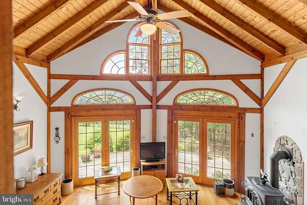 Log & Contemporary Styled Home - Nestled on 10 secluded acres, a nature lover's retreat! Step inside this 4-bedroom, 3-bath home with natural wood floors, doors, and trim throughout, creating a warm, inviting atmosphere. Love those wood cathedral ceilings and exposed beams throughout. The living room features a stunning stone fireplace, ideal for cozy evenings. An expansive addition includes a two-story great room with cathedral ceilings and a gas stove, offering ample space for gatherings. Eat-in kitchen with beamed ceilings, fully equipped with all appliances. Upstairs, a delightful loft overlooks the great room-perfect for a home office or reading nook. New roof 2014, quality Pella windows, full basement, circular drive, and 3 detached sheds for storage (or small barn). Lots of outdoor living space including front porch and back porches. Property has couple small natural springs. (Additional adjacent parcels available, can be purchased separately.) House can't be replicated at this price. Don't miss this opportunity to own a piece of paradise!