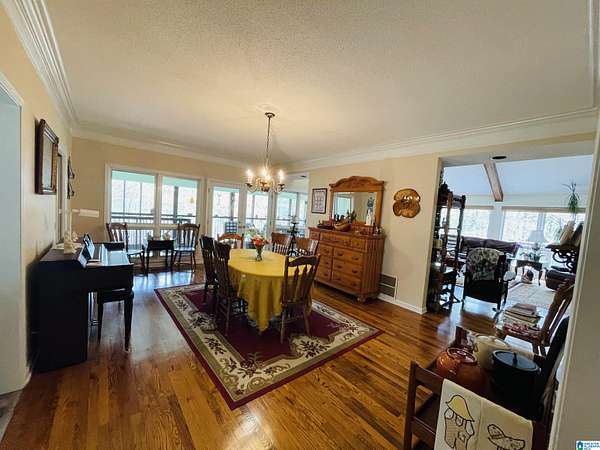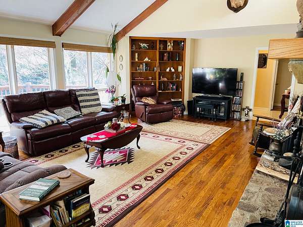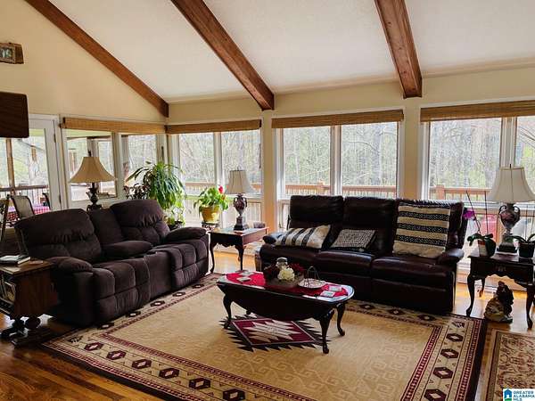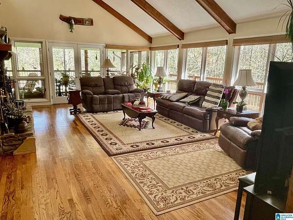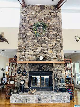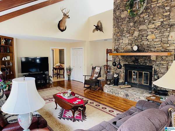 Feel like you are at home as you drive onto this secluded, magnificent 37.83-acre estate. This well-maintained property offers many features, including fruit-bearing trees and mature timber. Nearing your destination, you will notice the circular driveway surrounded by beautiful landscaping with a variety of colors. Terraced stone walls and walkways create a sophisticated feel. The unique design of this home invites you to enter with ease through the double garage or one of the covered entrances. Inside, the open-concept floor plan layout allows access to two or more areas of the spacious 4-bedroom, plus a bonus room, 3 bath home. The living room features a stunning 18-foot stone fireplace, vaulted ceiling, and exposed wood beams. The 72-inch floor-to-ceiling windows bathe the space in natural light and frame picturesque views. Step into the large screened-in porch and gaze at the private lake, or step out onto the open deck to soak in the natural beauty.