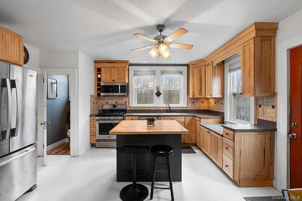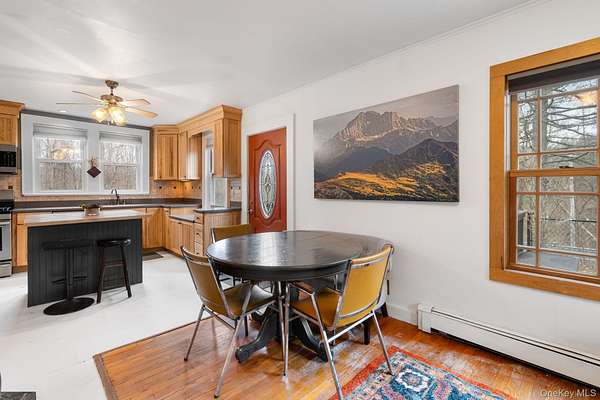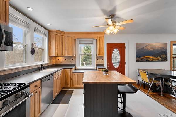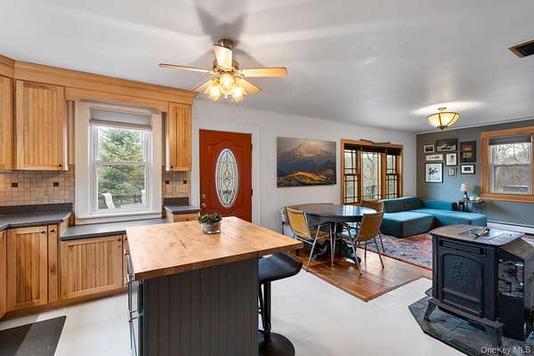Welcome to your colonial farmhouse perfectly situated in picturesque Germantown New York. Arriving at your new home you will immediately notice the nearly 2 acres of property, horseshoe drive, outdoor space with tiered decking and patio as well as the convenience of being minutes from the vibrant towns of Hudson, Catskill, Red Hook, Rhinebeck and Tivoli. Stepping into the sun drenched living space you will be welcomed by an updated kitchen featuring stainless steel appliances, custom built island, ample counter and cabinet space as well as a full walk-in pantry. The main level flows seamlessly from the kitchen to the dining area and into the living room with hardwood floors and cozy pellet stove. This main level also provides a half bath, laundry room and a large storage room with a sink, cabinetry and additional entrance. Ascending to the second level you will find 2 generous sized guest bedrooms, a full bath and the primary bedroom. Your primary bedroom has direct access to the side deck and it's own entry if desired as well as a large walk-in closet providing ample clothing racks and storage space. The open staircase to the third level adds to the potential for an additional living room, media room, home gym or office space. This home combines classic charm with modern updates, all in a location that offers both tranquility and easy access to some of the Hudson Valley's most sought-after destinations.