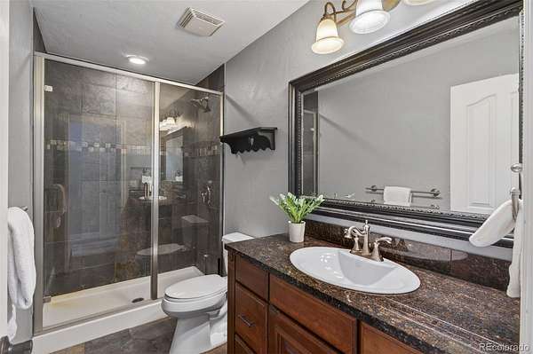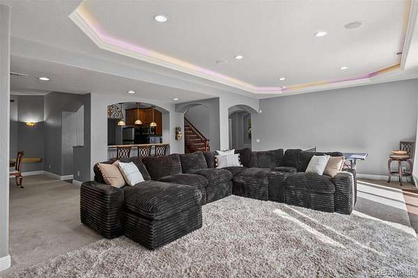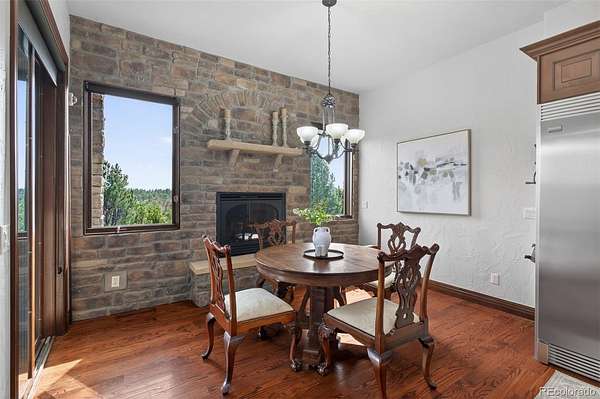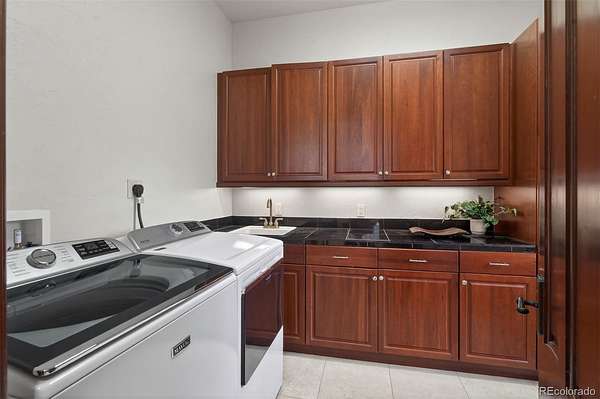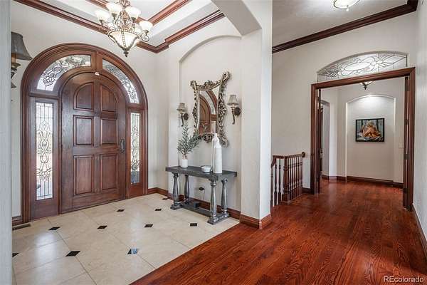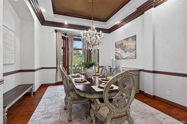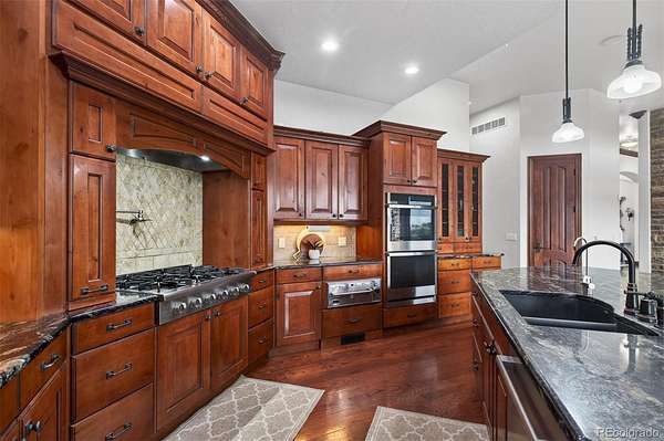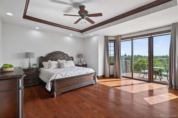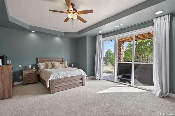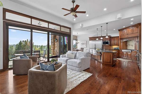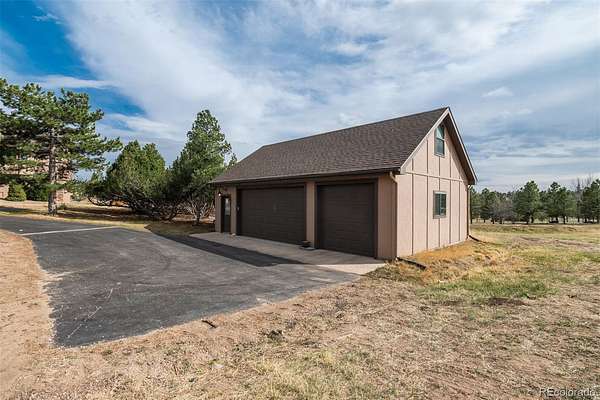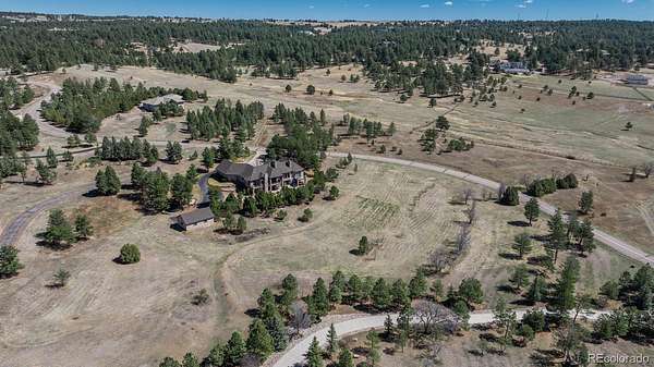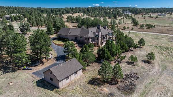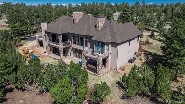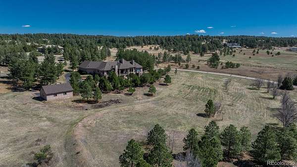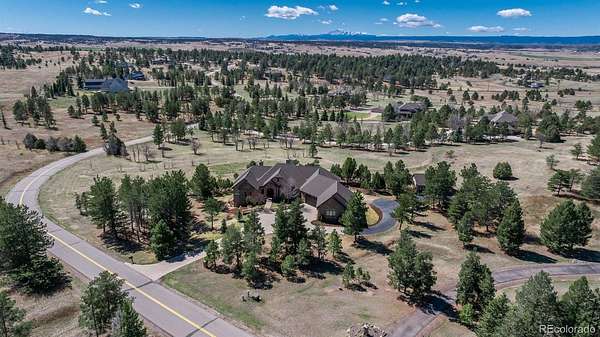 Set on five private, tree filled acres in the sought-after Sterling Tree Farm community, this striking 7,000-square-foot custom home blends modern style with timeless luxury, all framed by unobstructed Pikes Peak views. Thoughtfully designed as an ideal family home, it offers abundant space both inside and out, with plenty of room to live, gather, and play. The main level has been refreshed with updated, contemporary paint tones, creating a clean, elevated aesthetic that complements the rich mahogany detailing throughout. Designed with today’s lifestyle in mind, the layout offers generous, flexible spaces that allow families to spread out comfortably while still feeling connected. A chef-inspired kitchen with a Butler’s pantry anchors the space, while the formal dining room makes a statement. Two expansive main floor bedrooms each feature their own private laundry, offering comfort and convenience with a thoughtful, modern touch. Architectural highlights include a stunning main-level library that adds character and craftsmanship you don’t often find. The lower level is designed for both entertaining and everyday living, with 3 additional bedrooms, a second laundry room, a high end theater, and a beautifully finished secondary kitchen. A handicap-accessible basement entrance further enhances functionality and ease of access. Outdoor living is equally inviting, with a serene water feature, private patio, and three expansive decks perfectly positioned to take in the mountain views. There’s ample room for outdoor fun, including dedicated spaces to play and a classic horseshoe pit, perfect for gathering with family and friends. The property also includes an oversized four-car attached garage and a 1,800-square-foot outbuilding with a 3-car garage door ideal for storage, hobbies, or a workshop. Private, polished, and perfectly located near Parker, this home delivers space, style, and sophistication.