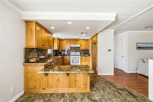 Step inside to a warm, inviting interior featuring updated flooring, crown molding, laminate wood flooring, a remodeled kitchen, and bathrooms with granite countertops. The home sits on a permanent foundation, providing long-term stability. There’s also an oversized parking area—perfect for work trucks, trailers, or recreational vehicles—as well as a storage shed for tools and supplies. The property is fully fenced and security-gated, giving you privacy and peace of mind.