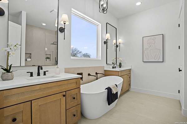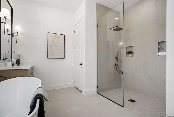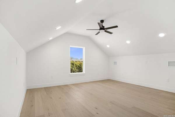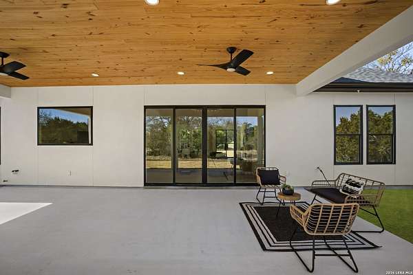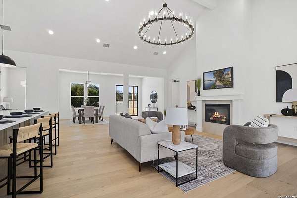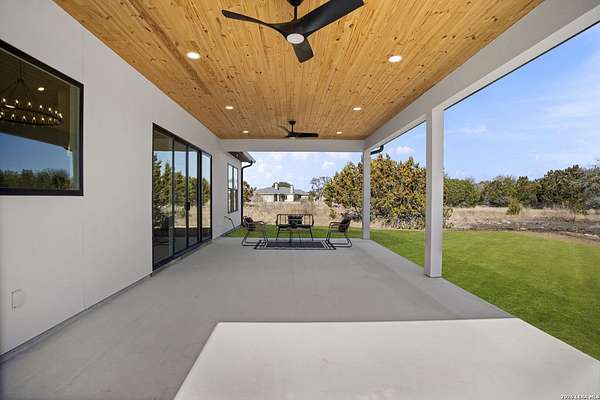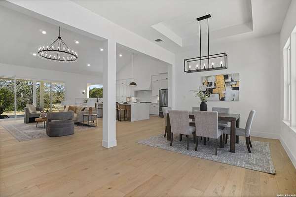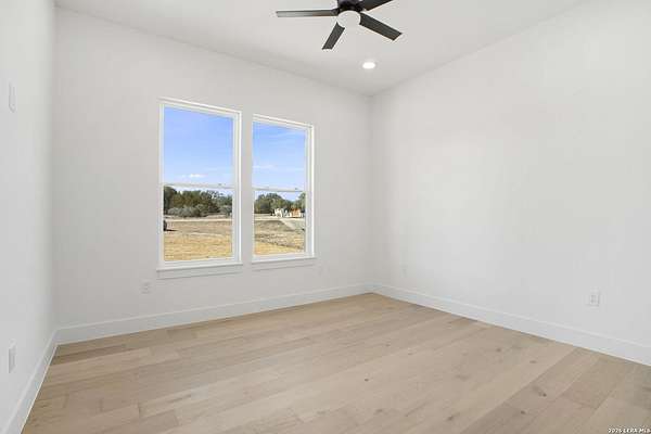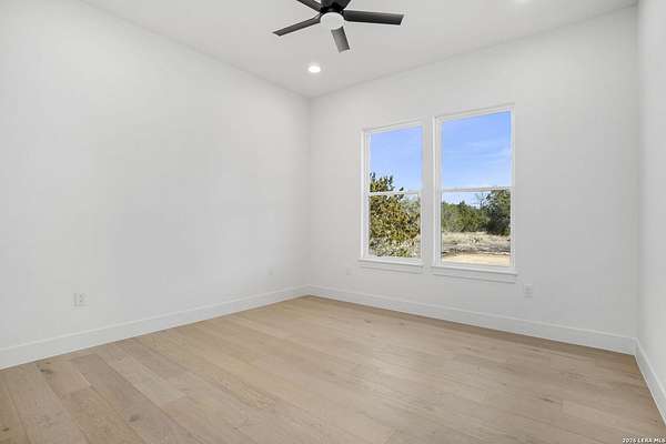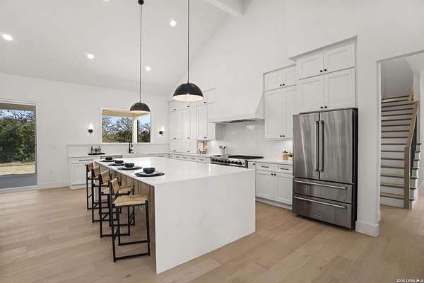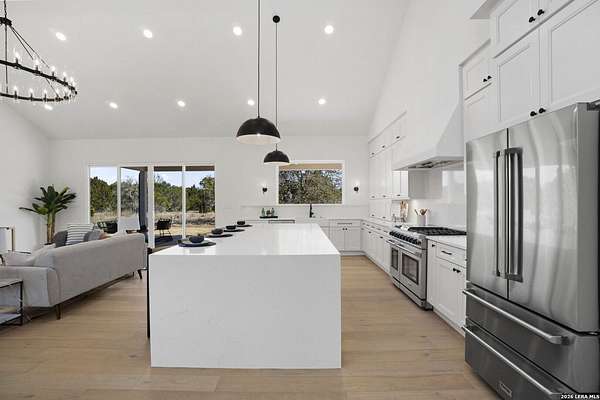 Welcome home to this beautifully crafted newly built modern residence situated on 2.01 acres in Bandera, Texas, offering the perfect blend of luxury, space, and Hill Country living. Thoughtfully designed with an open-concept layout, this home showcases quality craftsmanship and high-end finishes throughout. Vaulted and coffered ceilings enhance the spacious feel of the main living areas, while hardwood flooring spans the main level, including all bedrooms. The heart of the home opens into a bright and inviting living space, ideal for both everyday living and entertaining. The gourmet kitchen is a true centerpiece, featuring an oversized island, custom cabinetry, and a full THOR appliance package, including the refrigerator. A gas range, custom vent hood, and decorative sconce lighting framing the kitchen window combine style with functionality. The primary suite is conveniently located on the main level, offering a private retreat with ample space and comfort. An additional secondary suite upstairs provides flexibility for guests, extended family, or a private living area. This 4-bedroom, 3.5-bath home is turn-key and move-in ready, and includes a 1-2-10 builder warranty for added peace of mind. Outside, the expansive 2.01-acre lot provides privacy, room to roam, and endless potential for outdoor living, future enhancements, or simply enjoying the peaceful surroundings of the Texas Hill Country. This property presents a rare opportunity to own a high-quality new construction home on acreage-truly a must-see to appreciate the design, space, and setting.