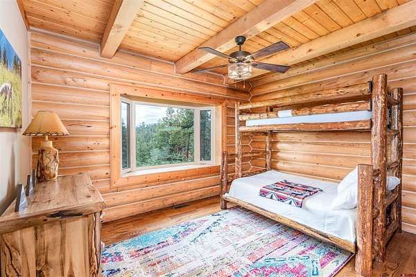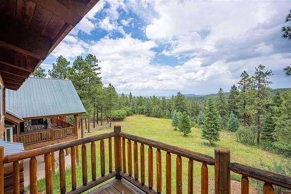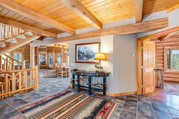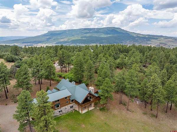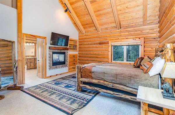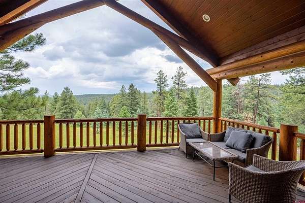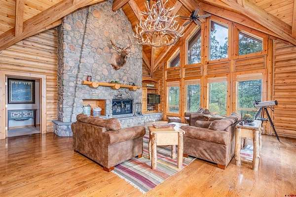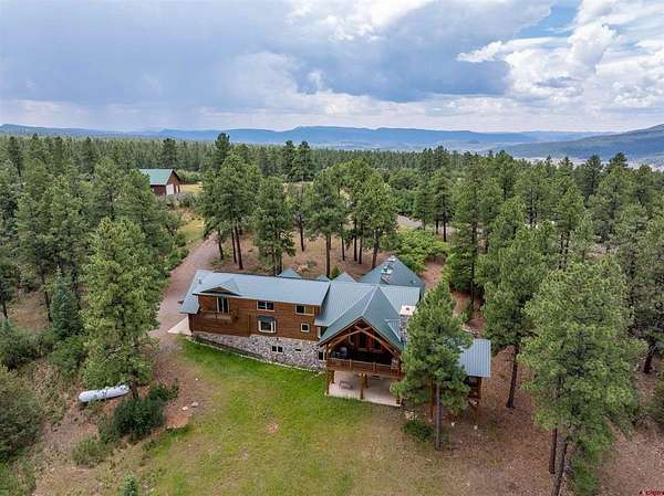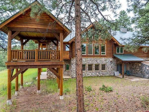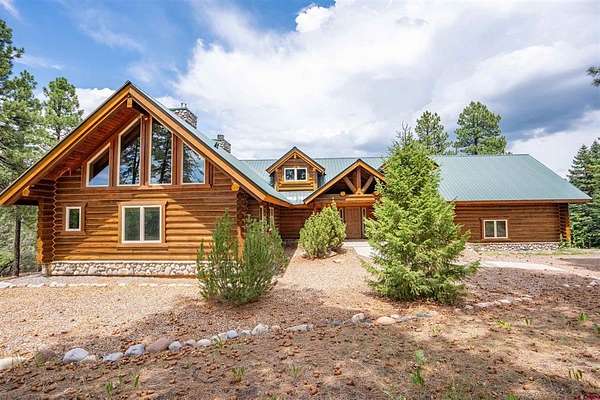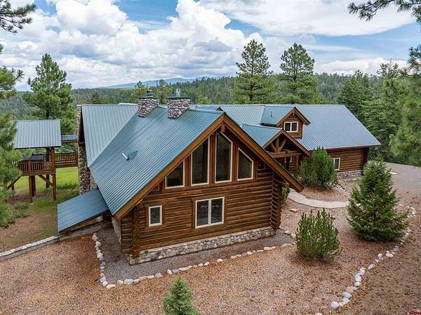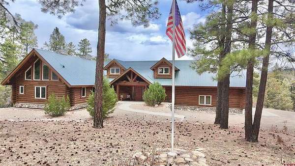Ashley Blackmore, Blackmore Group, O: 970-444-2431, ashley@ashleyblackmorehomes.com, www.crenmls.com: Welcome to Eagle Nest Ranch, an exceptional 5,849 sq ft hand-hewn log estate nestled on over 52 private acres in the exclusive Alpine Lakes Ranch community, just 30 minutes from the vibrant mountain town of Pagosa Springs and minutes from the peaceful community of Chromo. This turnkey luxury retreat offers stunning panoramic views of Archuleta Mesa and snow-capped peaks, backing directly to BLM and National Forest lands for year-round access to hiking, fishing, skiing, and more. The home showcases authentic full-round log construction, soaring vaulted ceilings, and dramatic river rock accents, comfortably accommodating 15+ guests with two primary suites, a bunkroom loft, and multiple living areas thats perfect for multi-generational living or vacation rentals. Interior highlights include hardwood floors, custom built-ins, radiant floor heating, a gourmet kitchen with stainless steel appliances, granite countertops, a wine fridge, and a spacious pantry. The grand great room centers on a striking stone fireplace, flowing effortlessly to the dining area and covered outdoor deck featuring its own fireplace, built-in grill, and spa gazebo for year-round enjoyment. Additional amenities include a media/game room with custom wet bar, heated workshop, secure gun safe, heated 2-car garage, detached 4+ car shop, RV hookups, and an 8.25 kW solar system. Located near Pagosa Springs' world-famous hot springs, dining, and shopping, plus Chromo's renowned fishing and quiet wilderness access. Eagle Nest Ranch offers the perfect blend of luxury, privacy, and outdoor adventure for your ultimate Colorado mountain lifestyle.