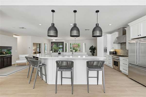 The 4,094 sqft renovated home includes 4 bedrooms and 4 baths, a 3-way split layout to include a private upstairs retreat and separate guest wing. A 2023 central kitchen anchors the open living and dining spaces all with lake views. White-oak wood-look tile runs throughout the main floor, while the 2023 primary suite offers a calm, modern retreat.