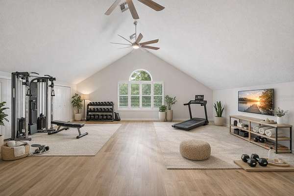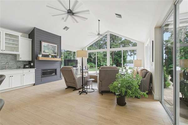 Indoor-outdoor living shines with a gas and electric option heated pool (2022), pavered deck, retractable screened porch, and outdoor shower. Mature oaks, long water views, and cleared acreage combine beauty and functionality for a rare lakefront lifestyle — all just minutes from East Orlando, 408, and 417.