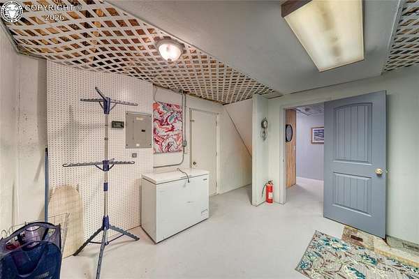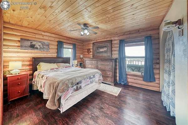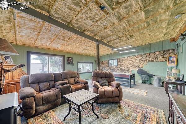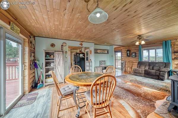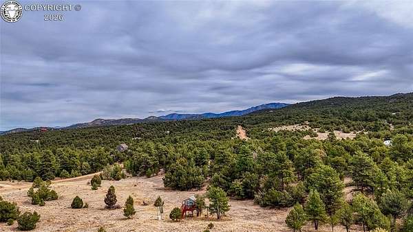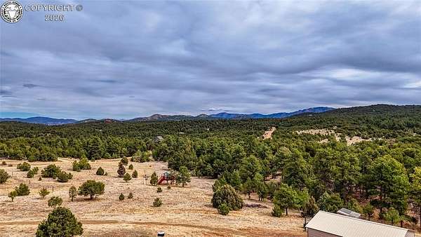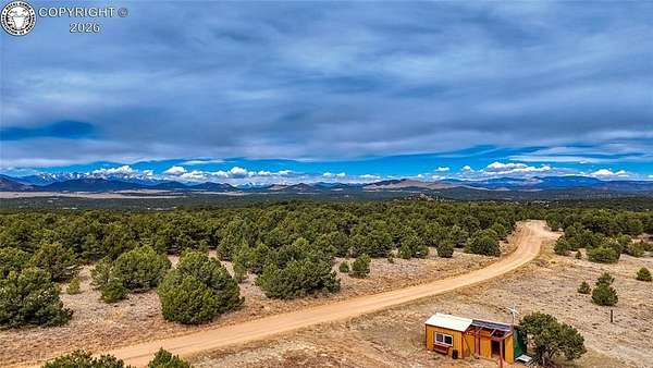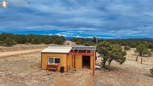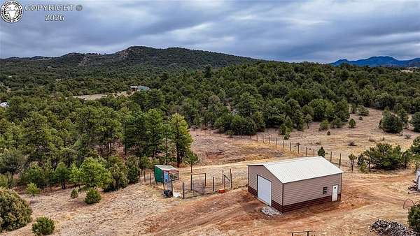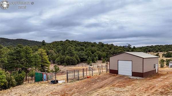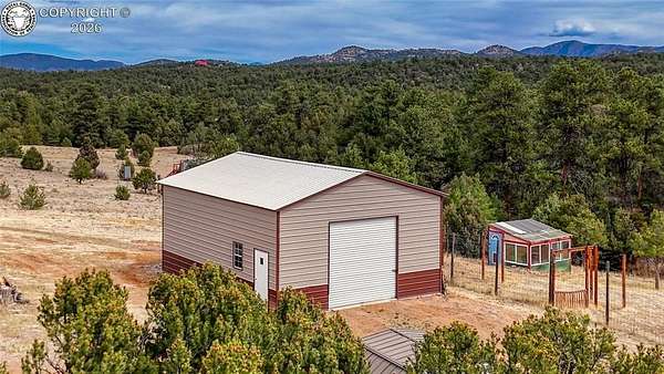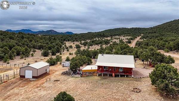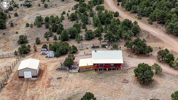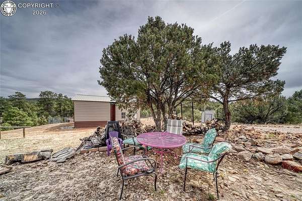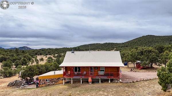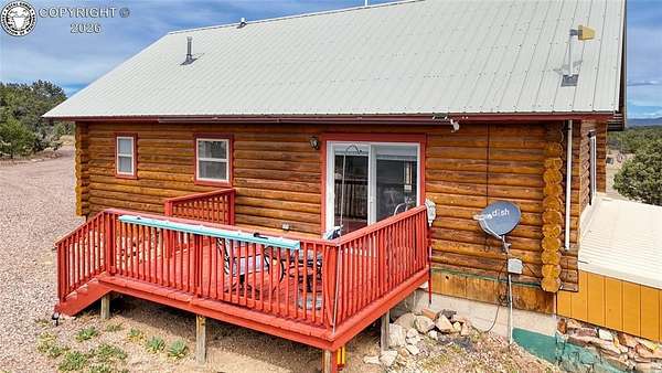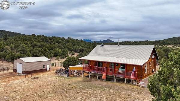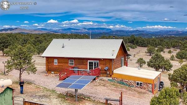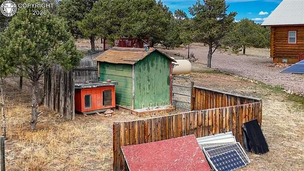 Say goodbye to your electric bill and step into true Colorado living. This off-grid mountain retreat on 10.59 acres offers privacy, self-sufficiency, and room to breathe, surrounded by mature Ponderosa and Pinon Pines and backing to expansive BLM land . The classic log cabin features an open floor plan with hard surface flooring, abundant natural light, and a thermostat-controlled pellet stove creating a warm, comfortable main living space. The home includes 2 bedrooms, 1.5 baths, multiple living areas, and a spacious game/den room with a wood-burning stove, ideal for cozy evenings, plus ample storage throughout. Outside, the property is set up for both relaxation and function. Enjoy a covered front porch, large deck, and a separate shaded seating area. Additional features include a greenhouse, fenced garden, enclosed chicken coop, treehouse, 720 sq ft shop/garage, loafing shed, and a small fenced area for livestock. A 2-acre fenced goat or sheep pen with 8' predator-safe fencing and natural rock outcroppings adds even more versatility. The circular driveway provides easy access for vehicles, trailers, and equipment. Furnishings are negotiable.